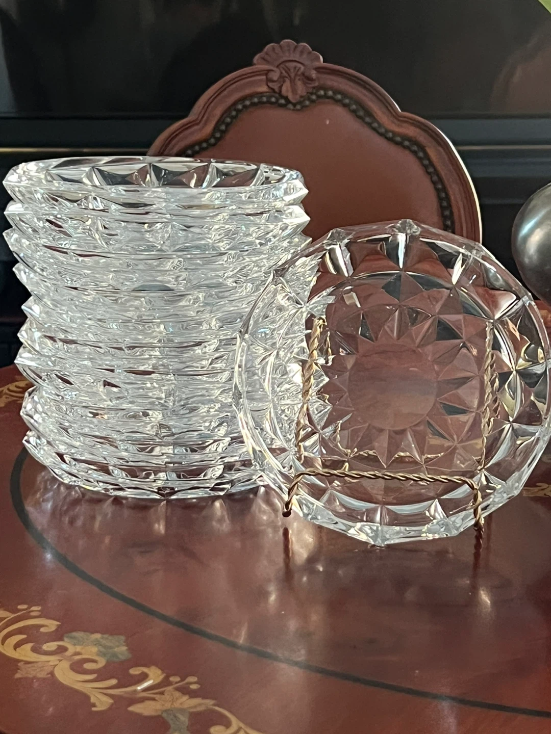 Selling a set of 10 beautiful crystal glass coasters. They have a lovely geometric design and would look great in any home. Perfect for protecting your furniture from condensation!