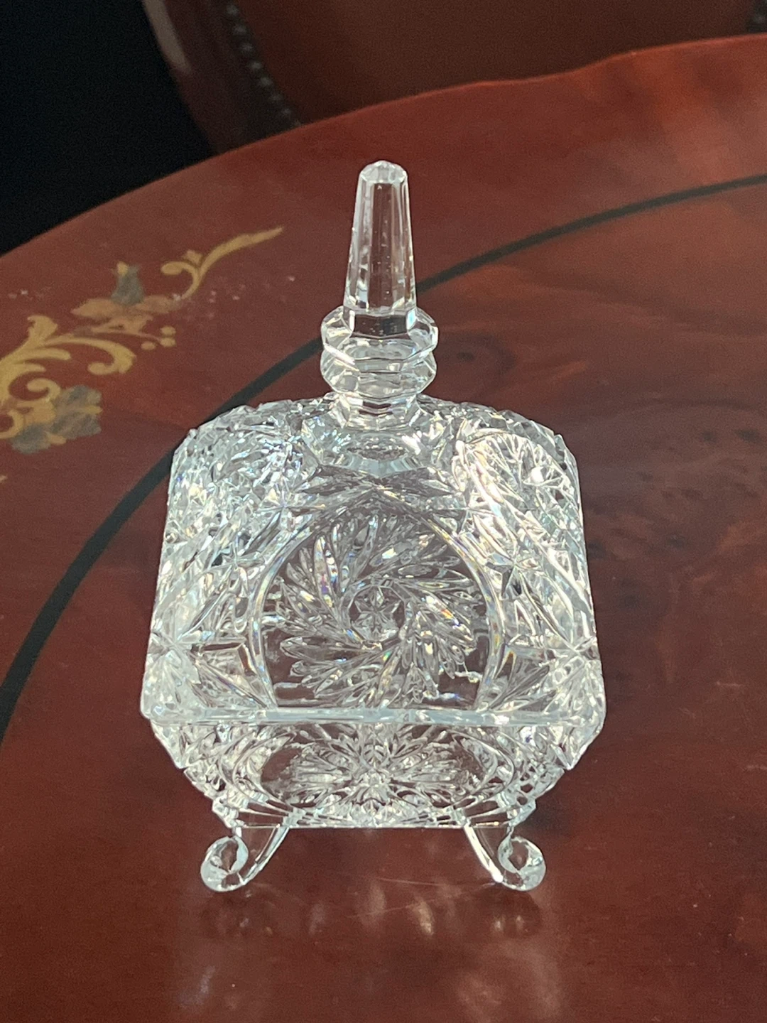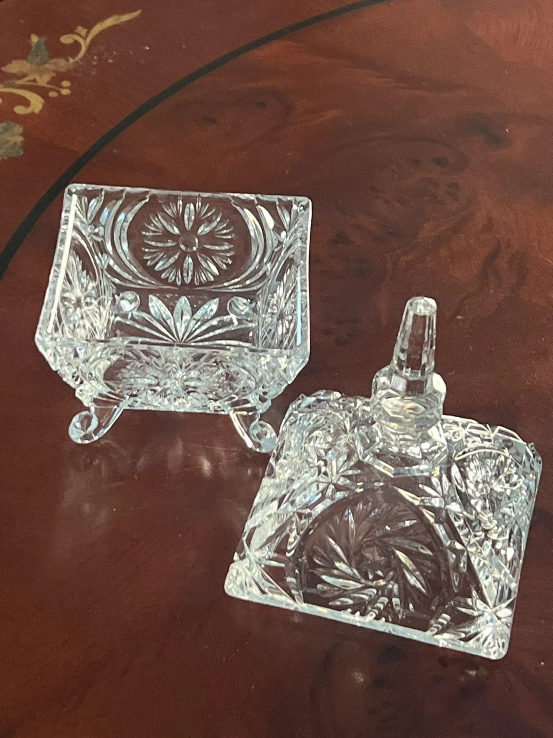 Selling a lovely vintage crystal trinket box. It features a beautiful floral design and a square shape with a lid. Perfect for storing small items or adding a touch of elegance to your space