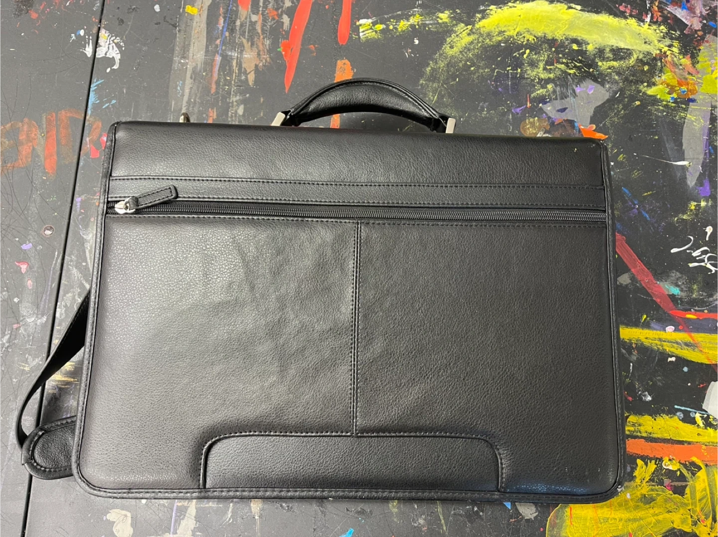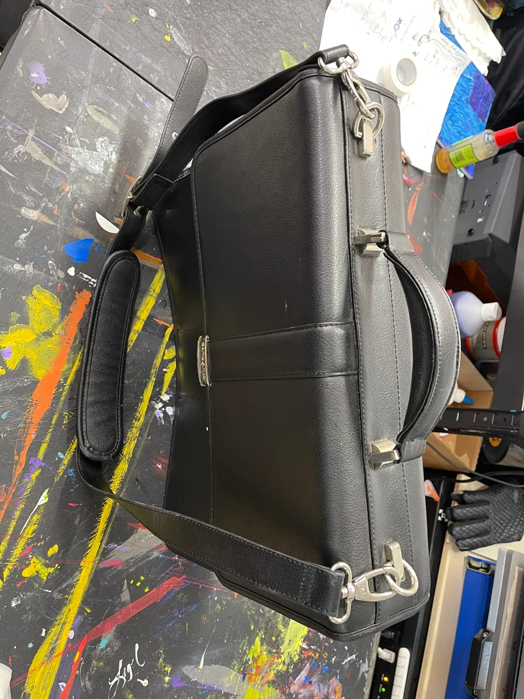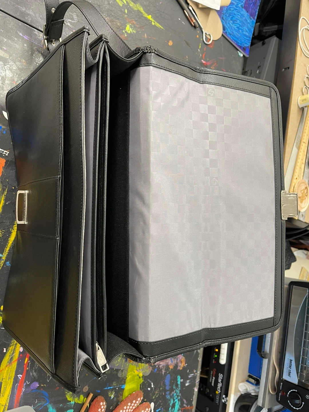 Selling a black leather Samsonite briefcase. It features a handle and a shoulder strap for easy carrying. The interior is lined with a gray checkered fabric. Perfect for work or travel!