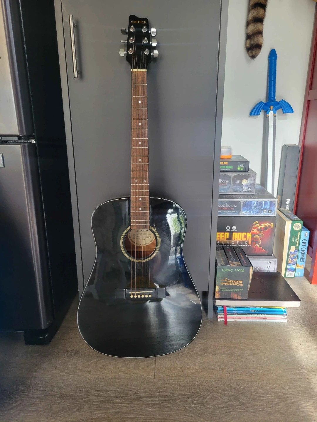 Samick acoustic guitar, model SW015DB. It's in good condition and probably just needs a good dusting/tuning. Comes with a case if you need one.