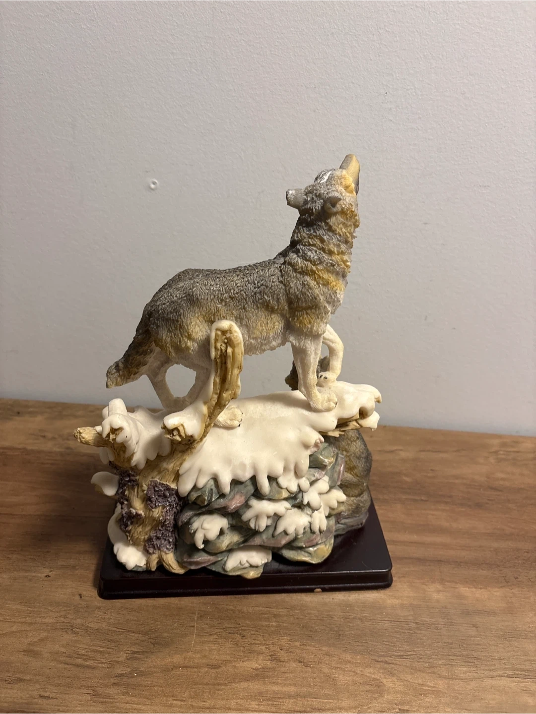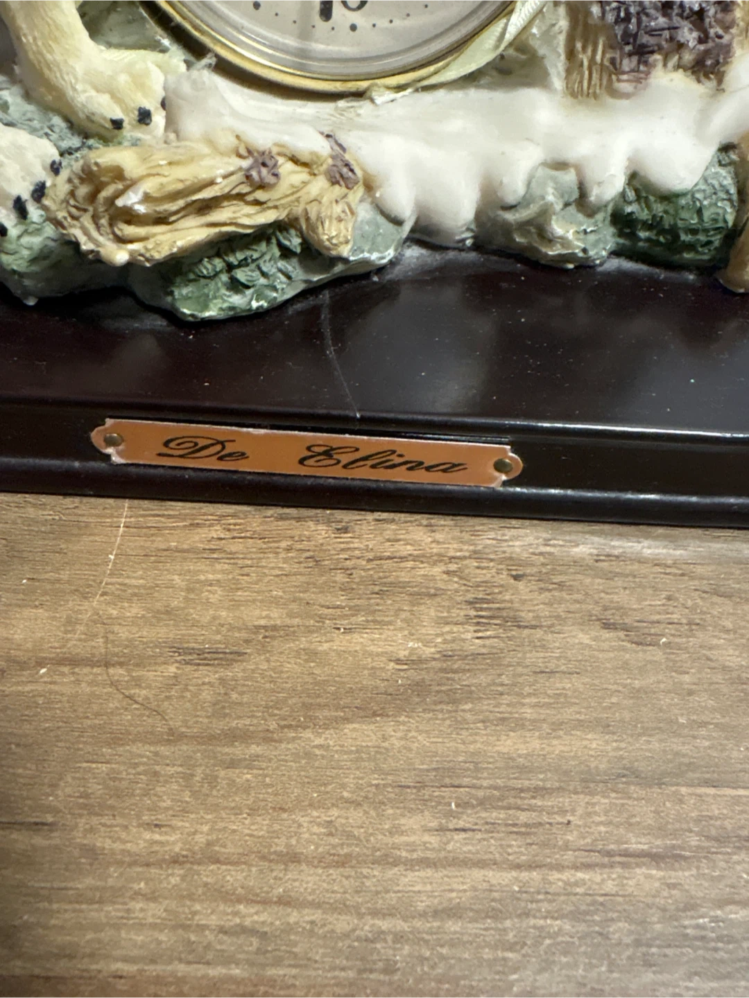 Here's a unique De Elina wolf clock! It's a beautiful decorative piece featuring a wolf howling on top of a snowy scene with a smaller wolf and a clock in the middle. Perfect for adding a touch of wilderness charm to your home.