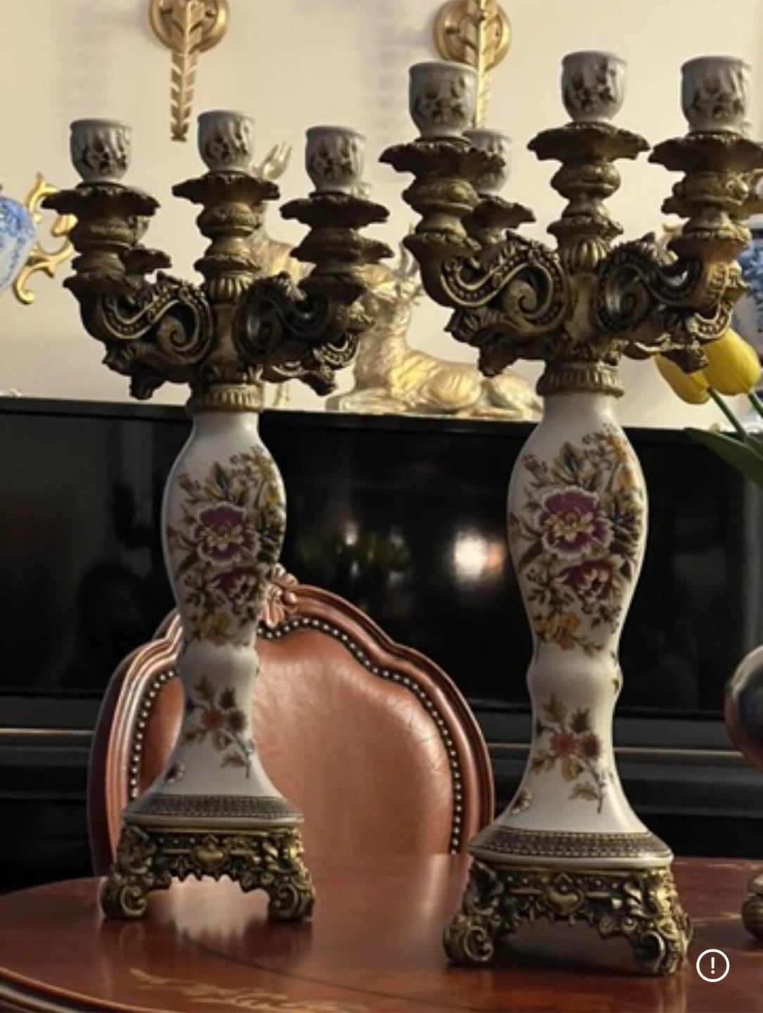 Selling a vintage candelabra with a beautiful floral design. It has an ornate, antique look with gold accents and a white base adorned with floral patterns. It would be a lovely addition to any home decor!