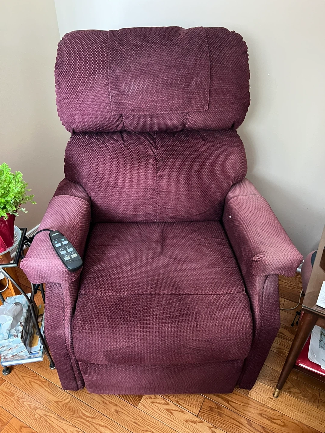 Selling a purple Pride lift chair recliner. It comes with a remote. There are some signs of wear on the arm. Motor works great.