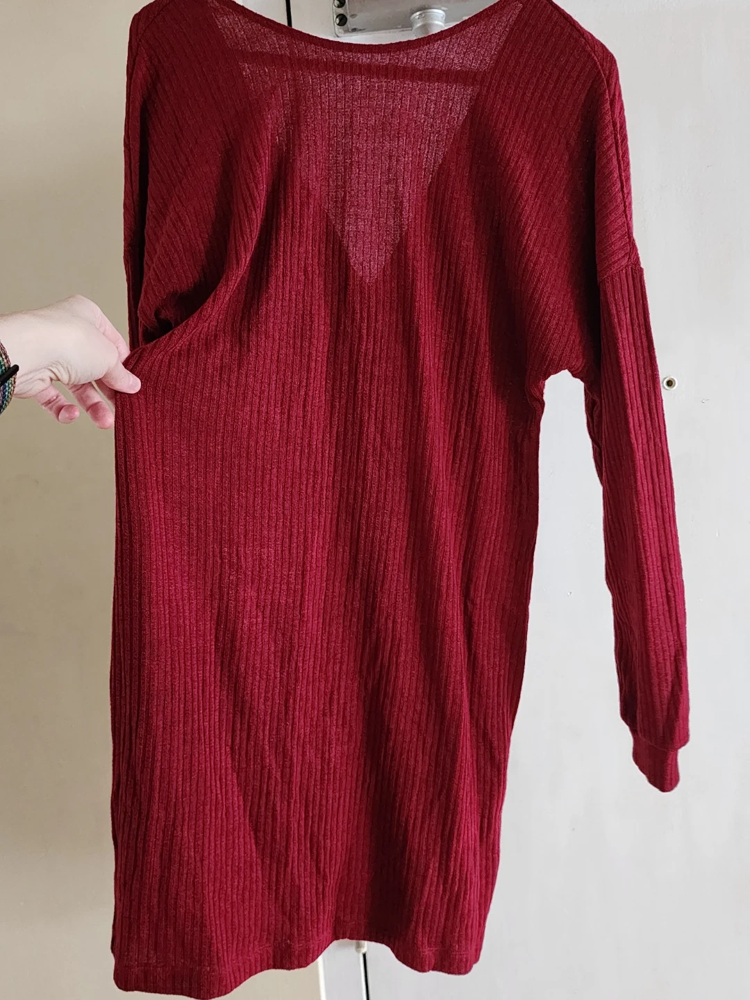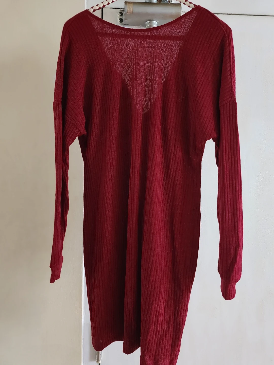 Offering a lovely burgundy long-sleeve dress.