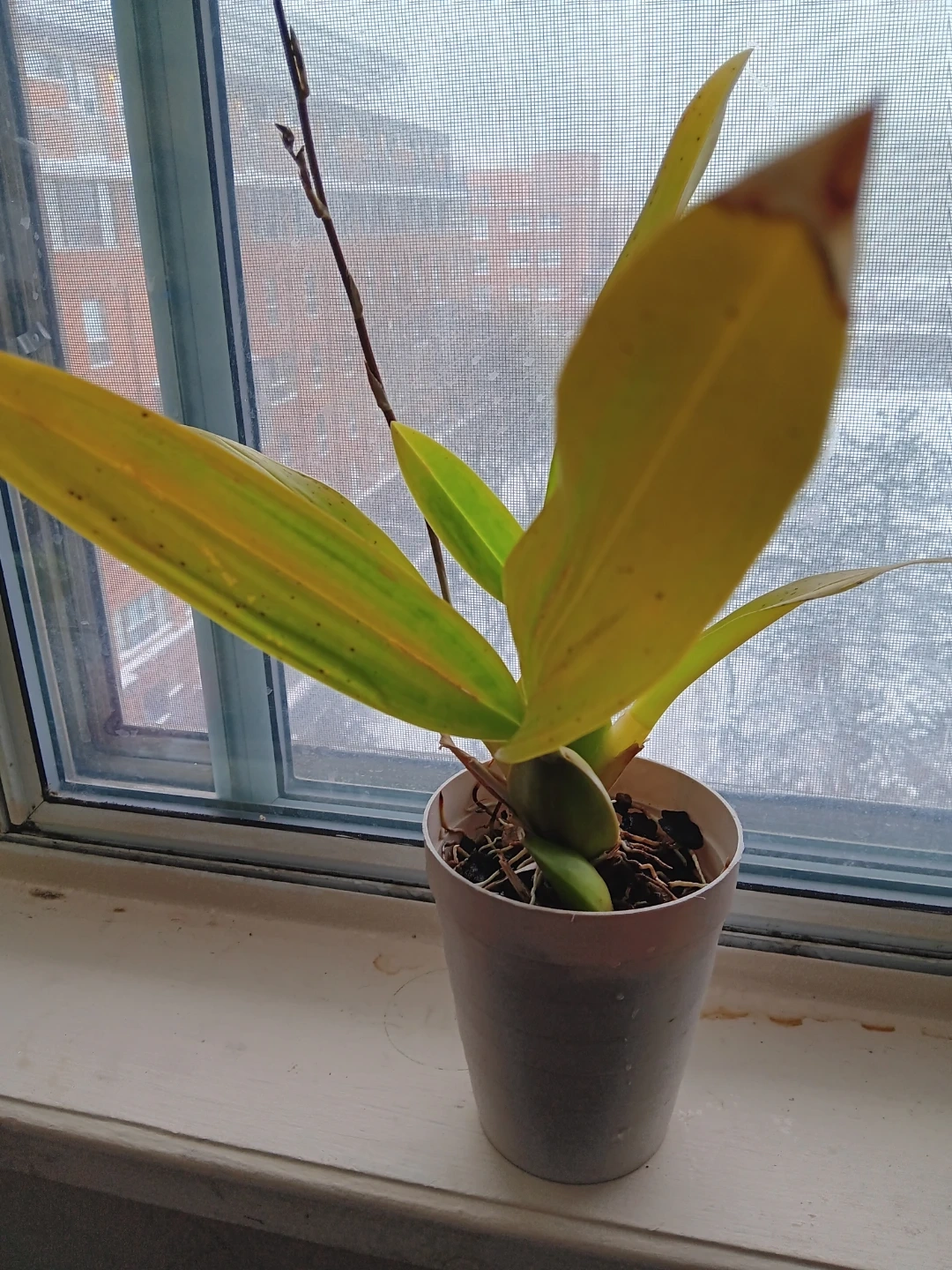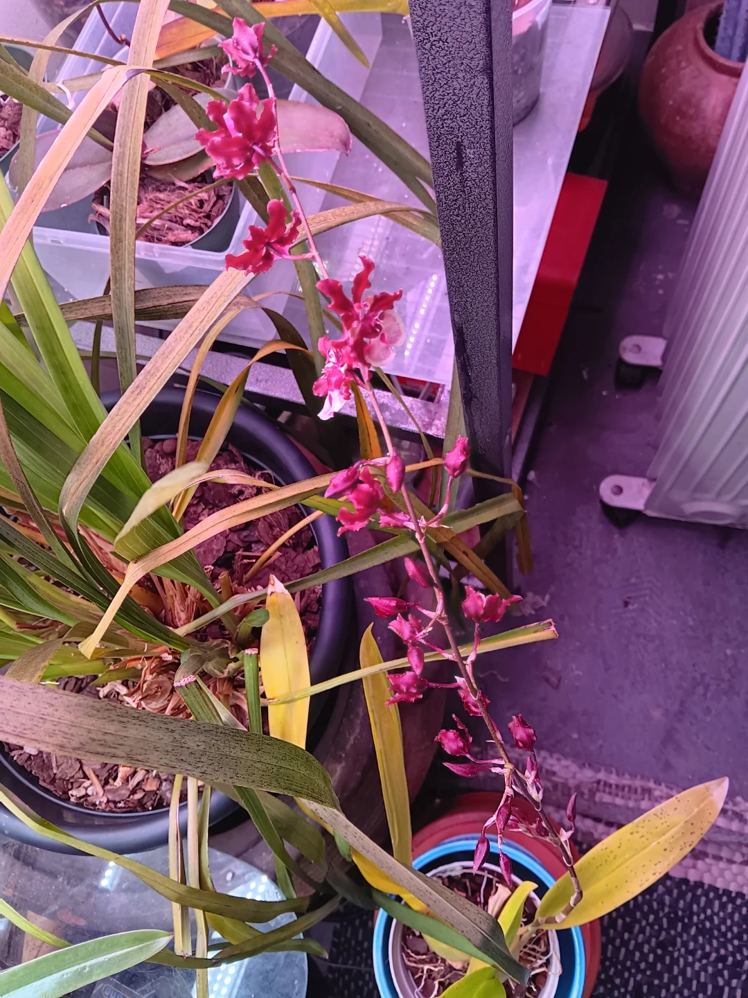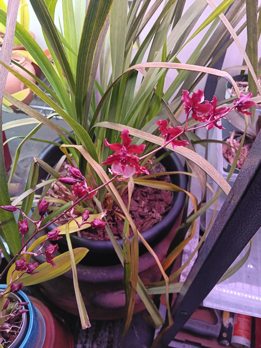 Selling a potted oncidium orchid plant - Sharry Baby. It is soon to be in bloom, with chocolate scented flowers. It's currently in a plastic pot