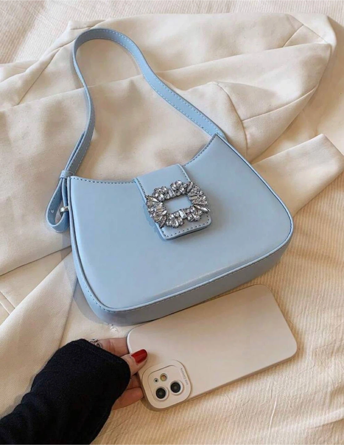Stunning light blue baguette bag. Features a large crystal buckle. Adjustable shoulder strap. Perfect for everyday use or special occasions.