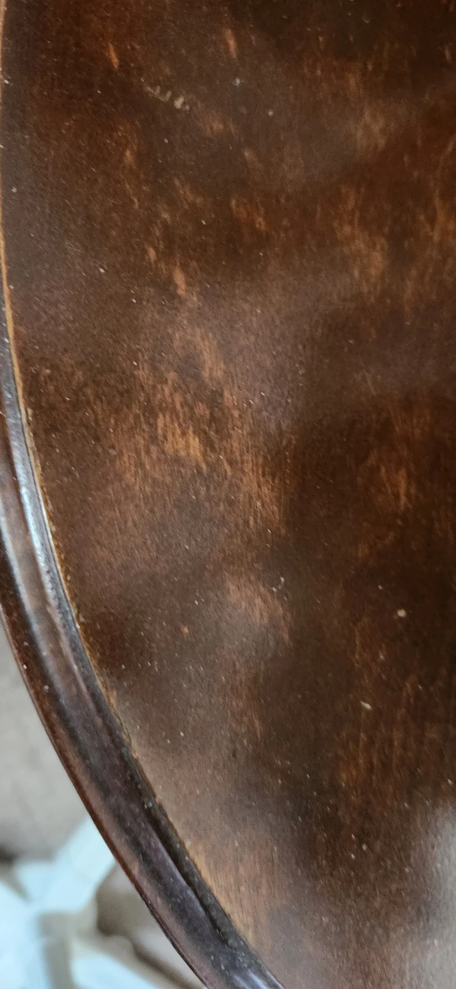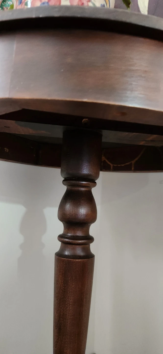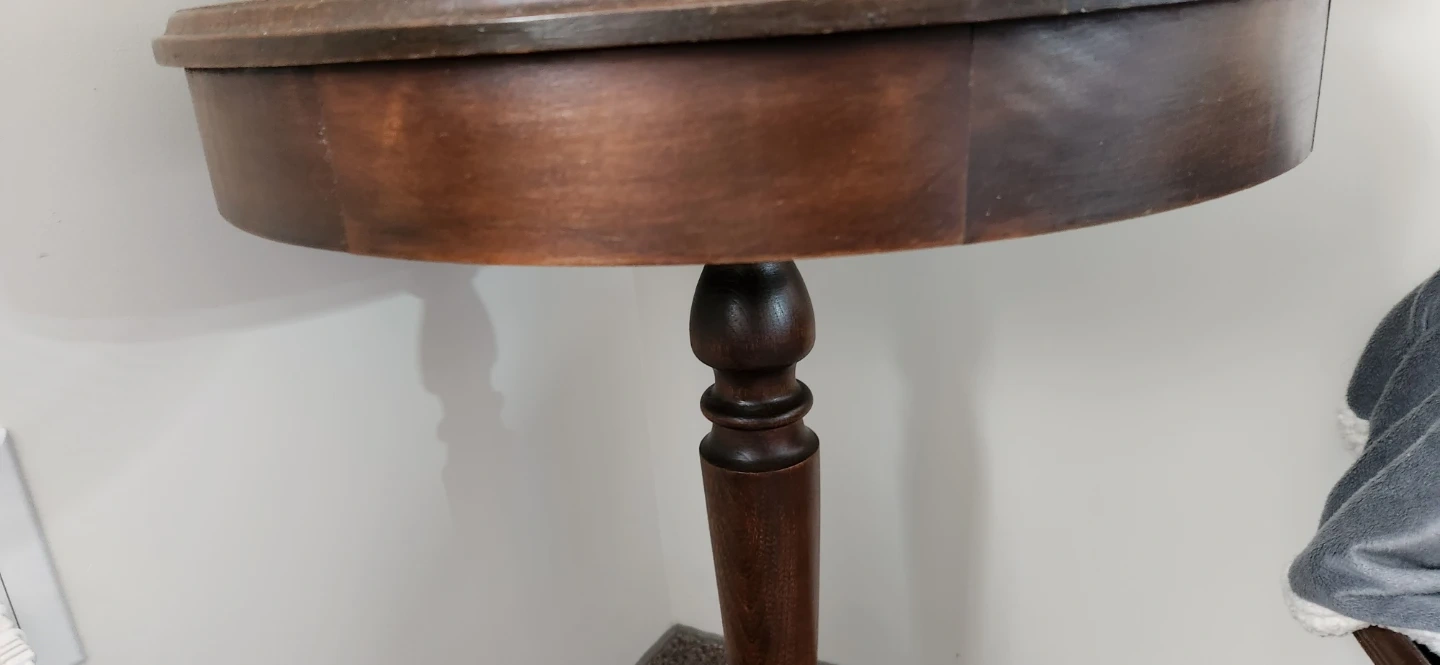 Selling a round wooden accent table. It has a classic design with a sturdy base. The table shows some signs of wear on the top surface, but it's still a functional and stylish piece for any room