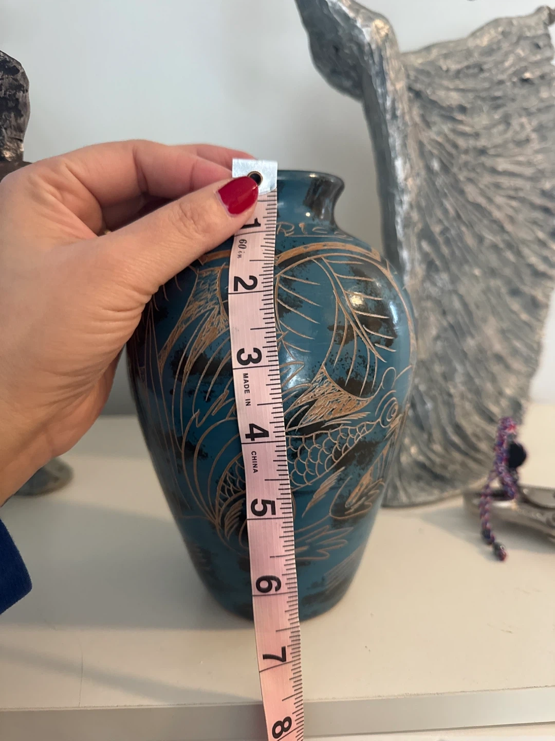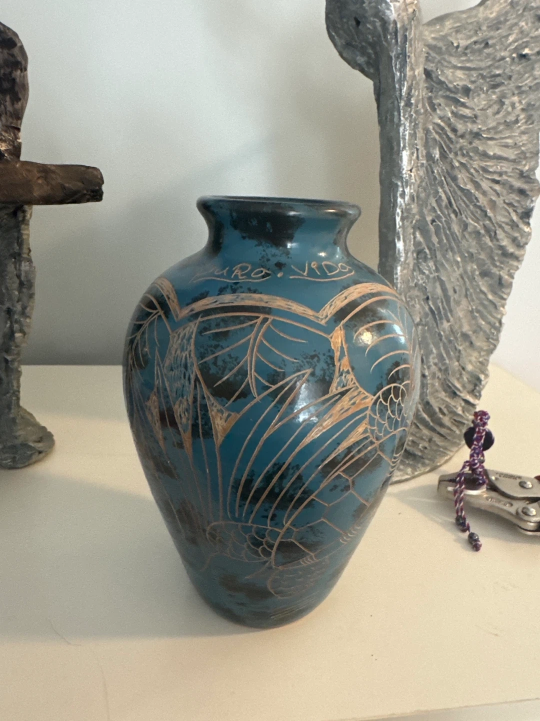 Selling a blue vase with Costa Rica inscribed on the top. It features a leaf design and a fish design. The vase is approximately 7 inches tall.