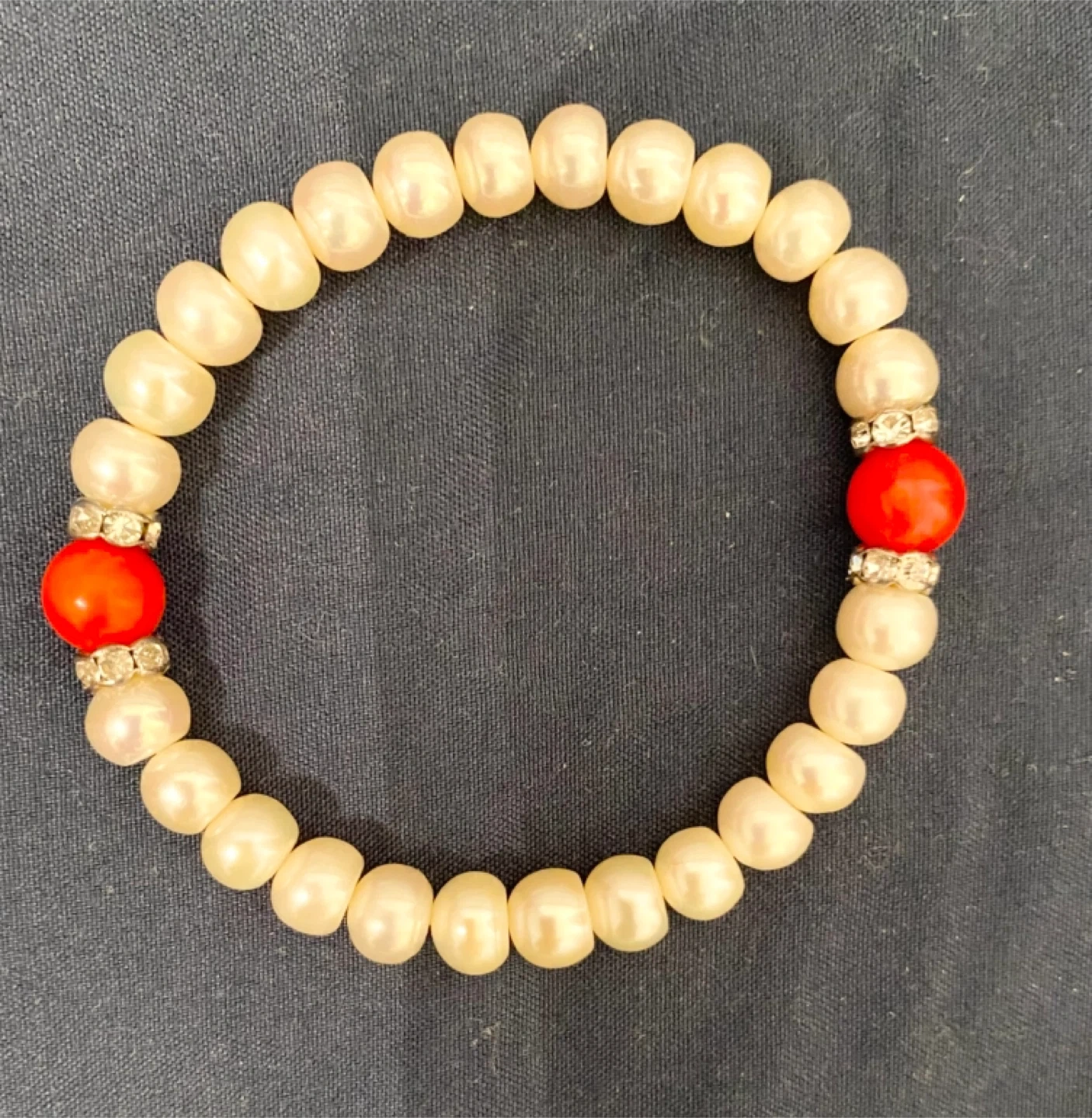 This is a cute pearl bead bracelet! It features cream-coloured pearl beads and two red beads with rhinestone accents. Perfect for adding a touch of elegance to any outfit!