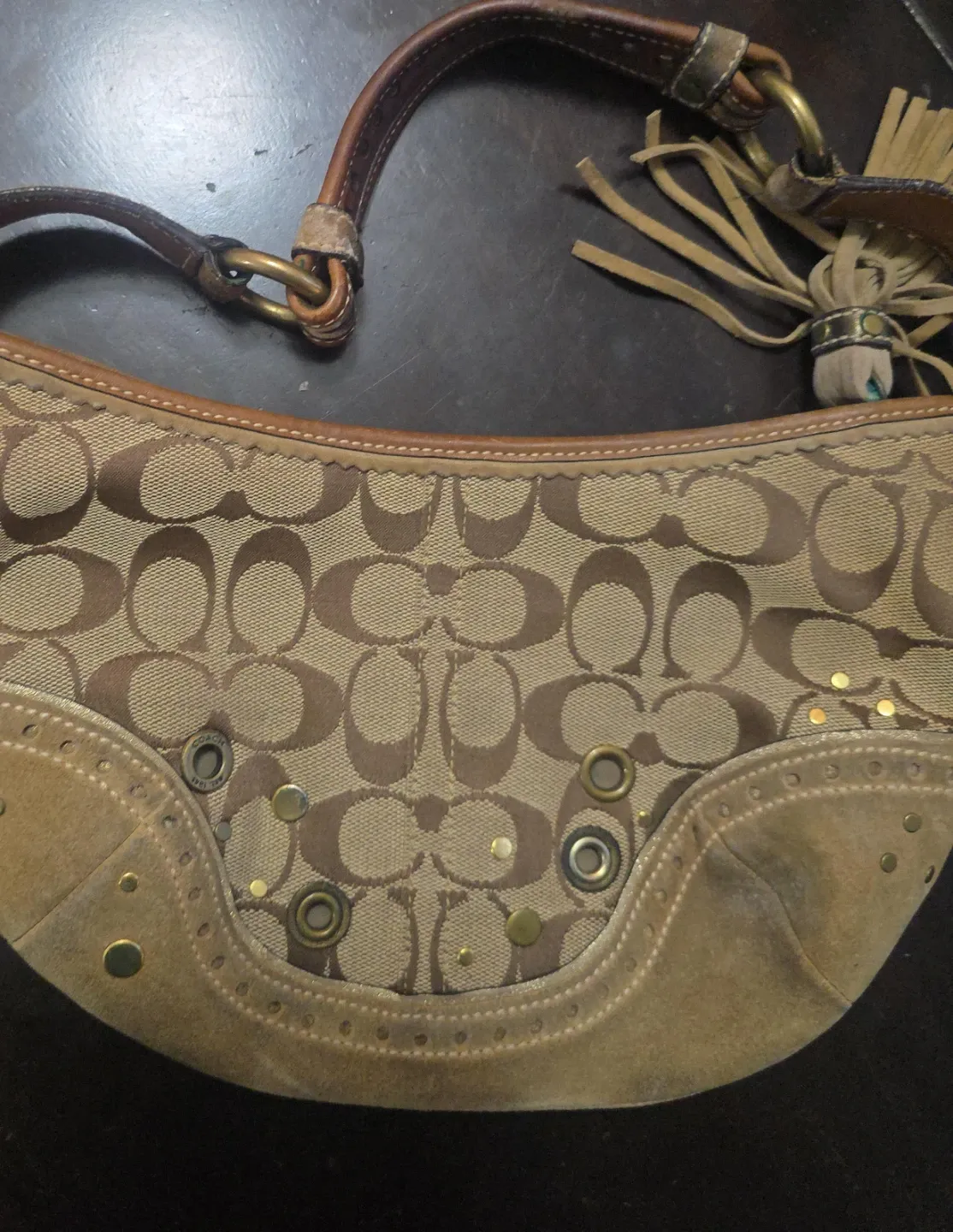 Selling a Coach hobo bag with the signature "C" pattern on the canvas. It features a leather handle and suede accents with decorative studs. A stylish and functional bag for everyday use!