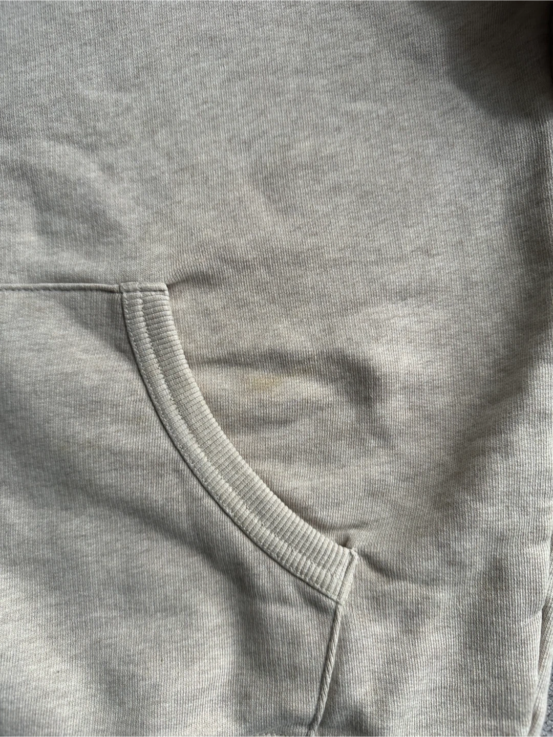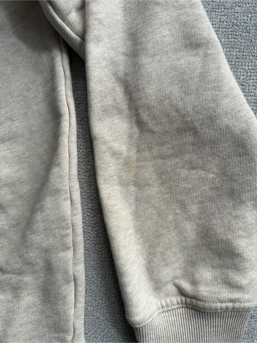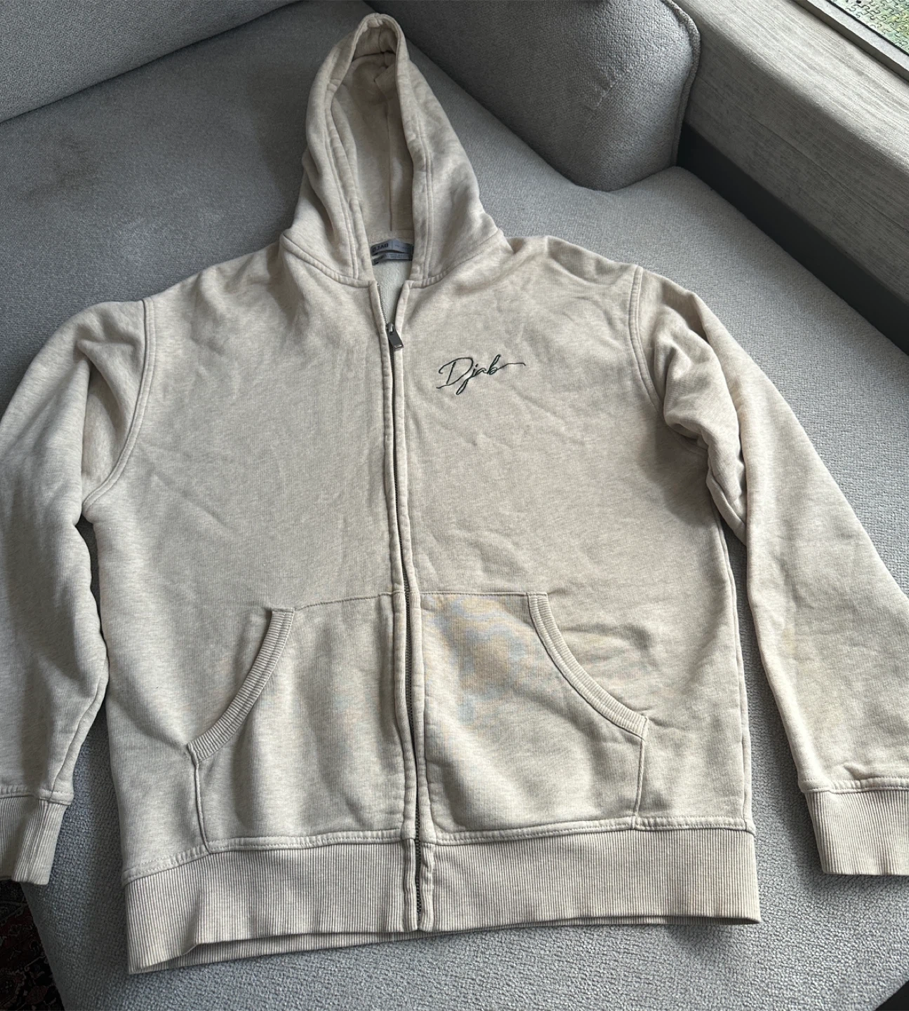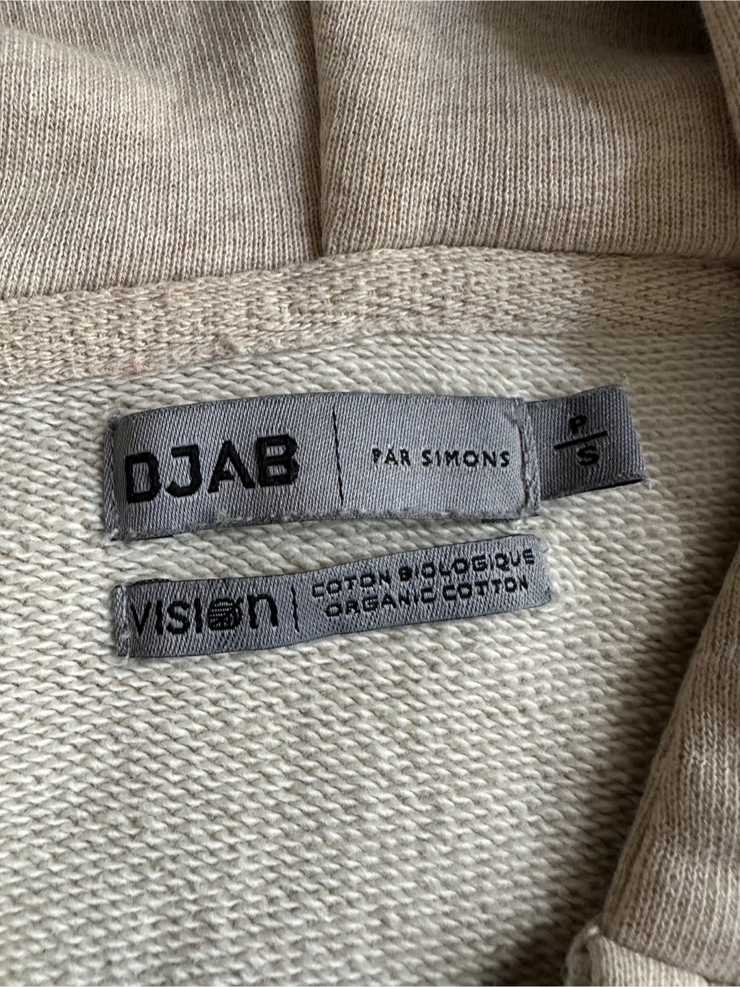 Selling a DJAB Par Simons zip-up hoodie in beige. It's a size small and made from organic cotton. There are some stains on the front and sleeve, as shown in the photos.