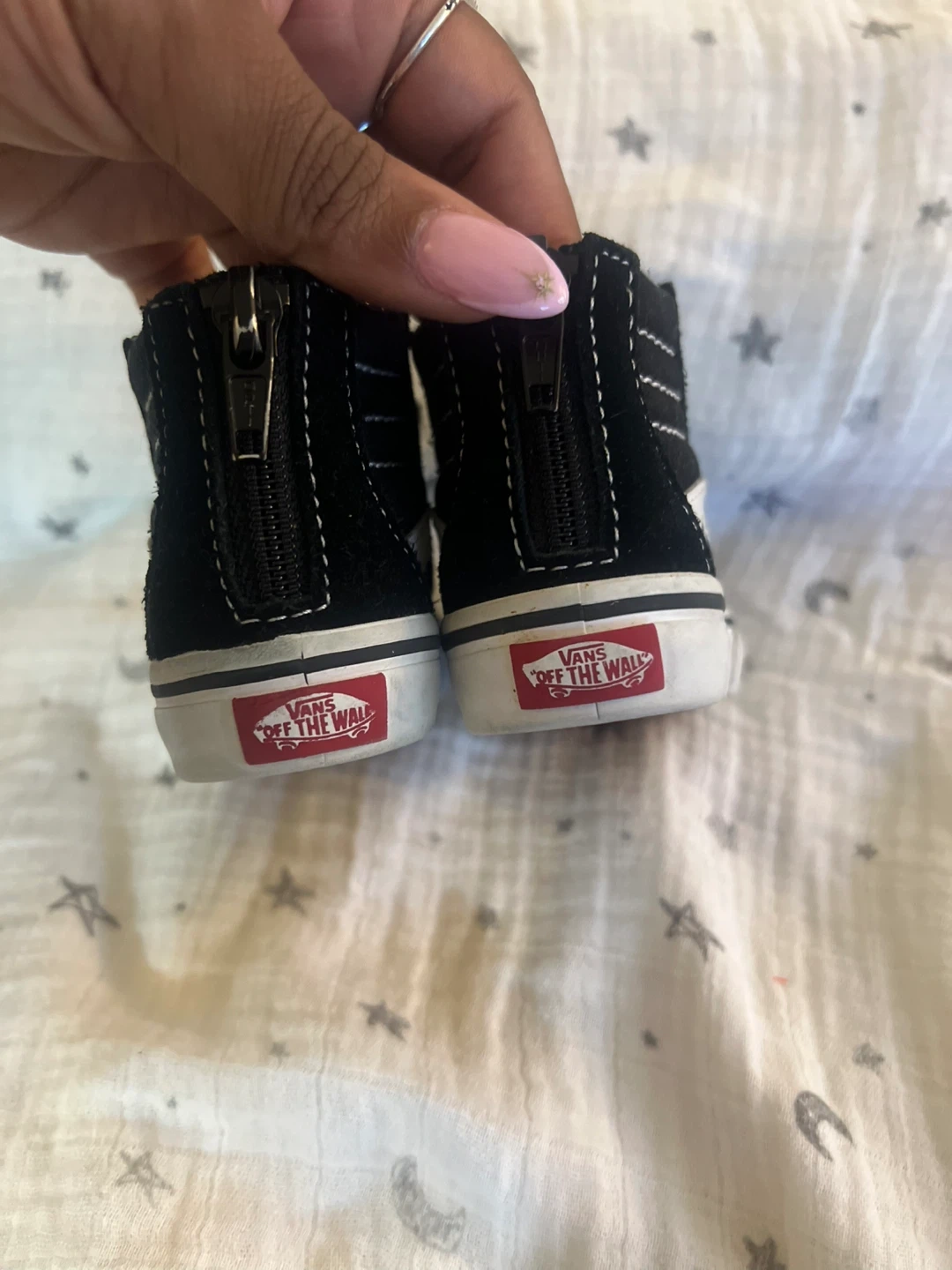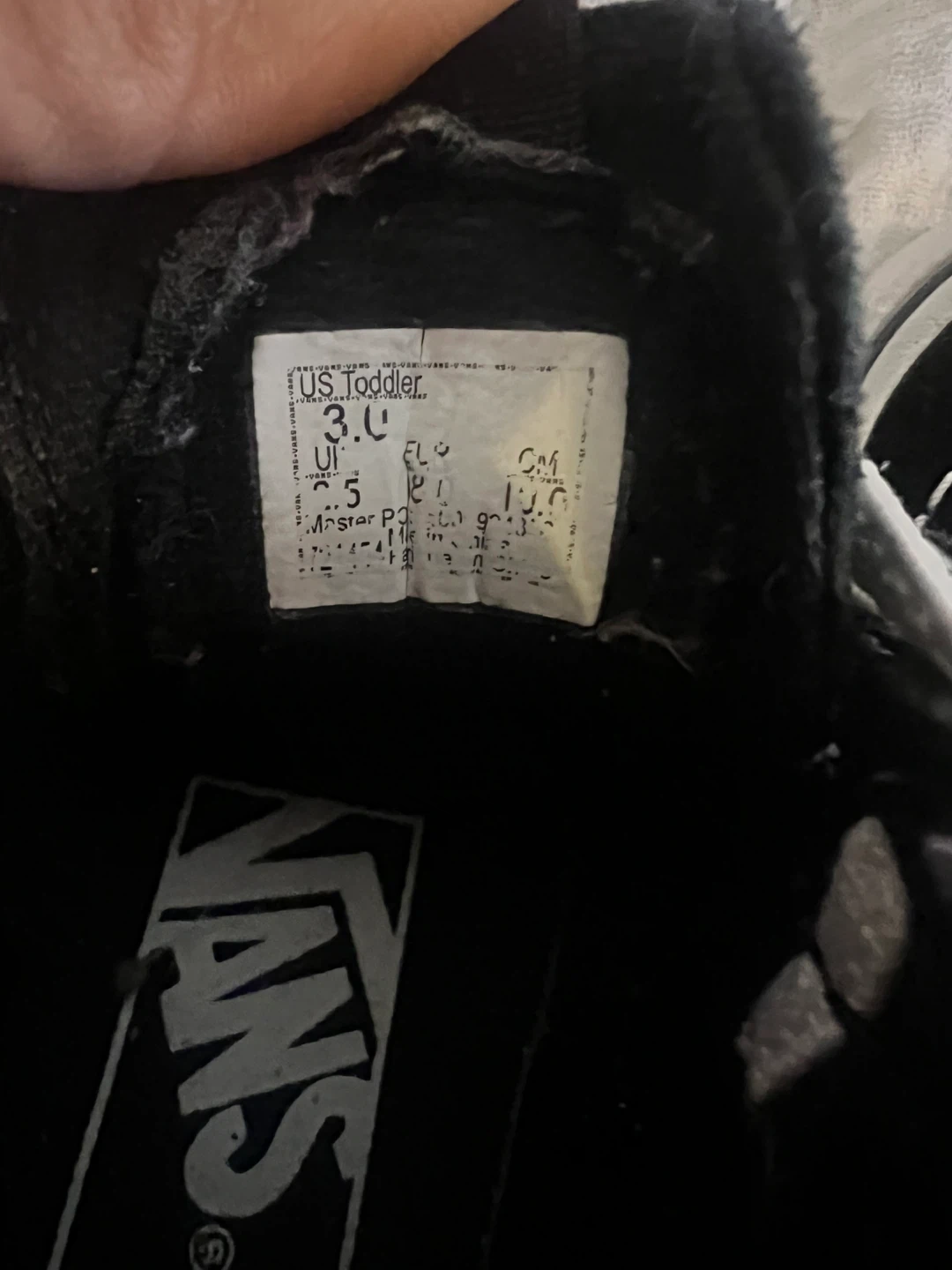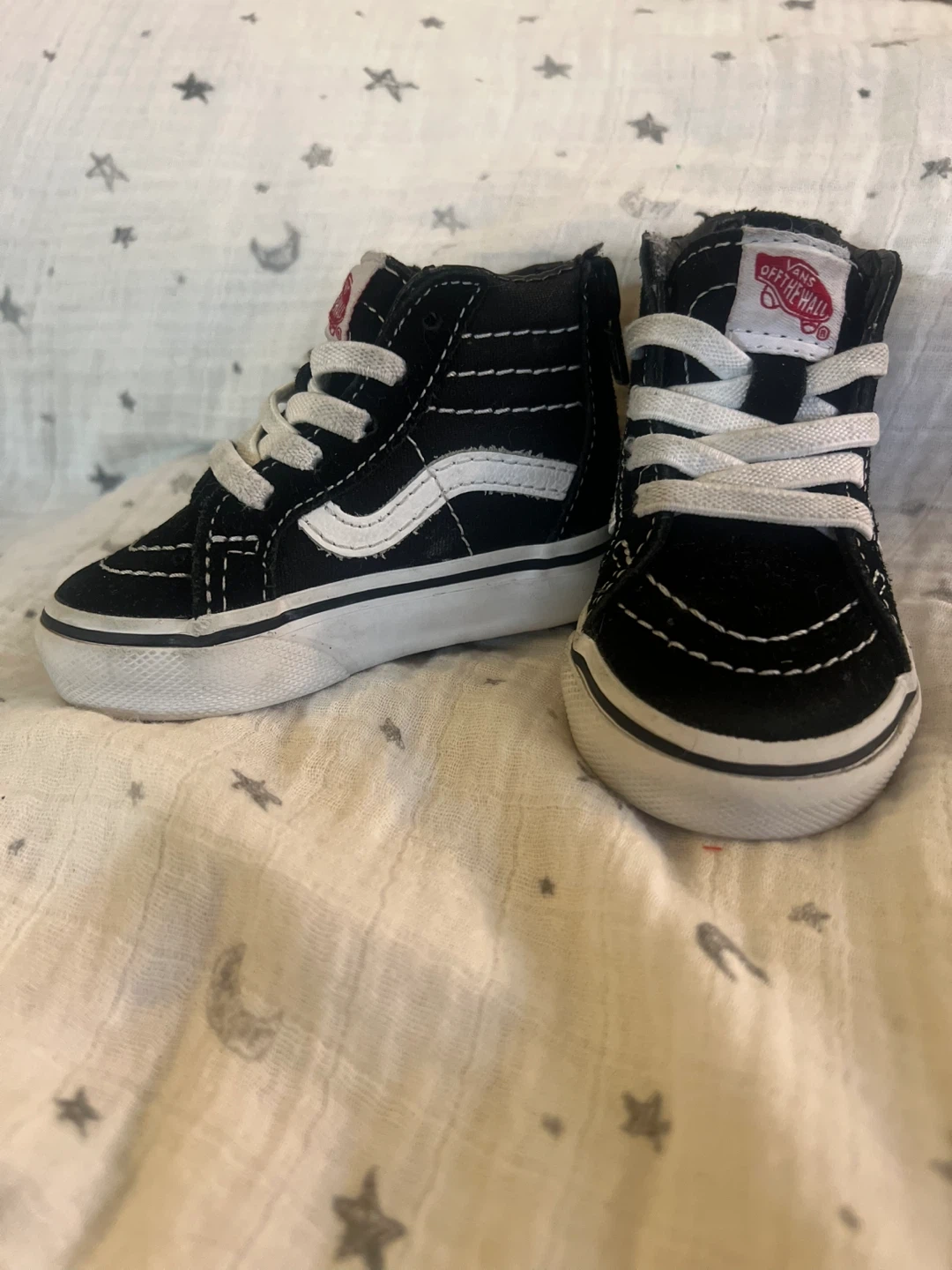 Selling a pair of Vans Off The Wall toddler shoes in black. They have white laces and the Vans logo on the tongue and back. Great for your little one!