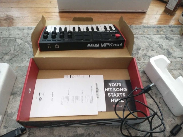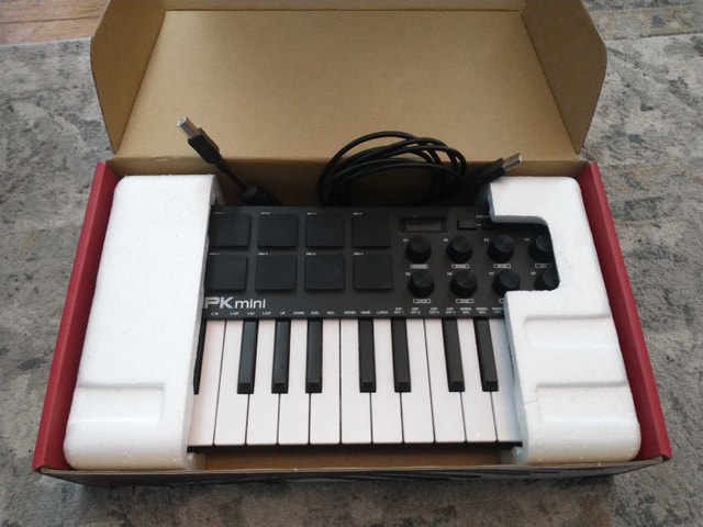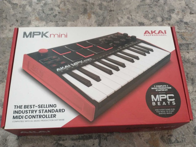 Selling Akai MPK Mini mk3 in excellent condition/ barely used. Everything that came in the box originally is included here. "This compact USB MIDI keyboard controller is perfect for music production on the go or in a small studio setup. The Akai MPK Mini features 25 velocity-sensitive keys, 8 backlit MPC-style pads, and assignable knobs to give you full control.." Key Features: * 25 velocity-sensitive keys * 8 backlit MPC-style pads with Note Repeat & Full Level * Assignable knobs for mixing, tweaking plug-ins and more * USB powered and class-compliant for Mac & PC