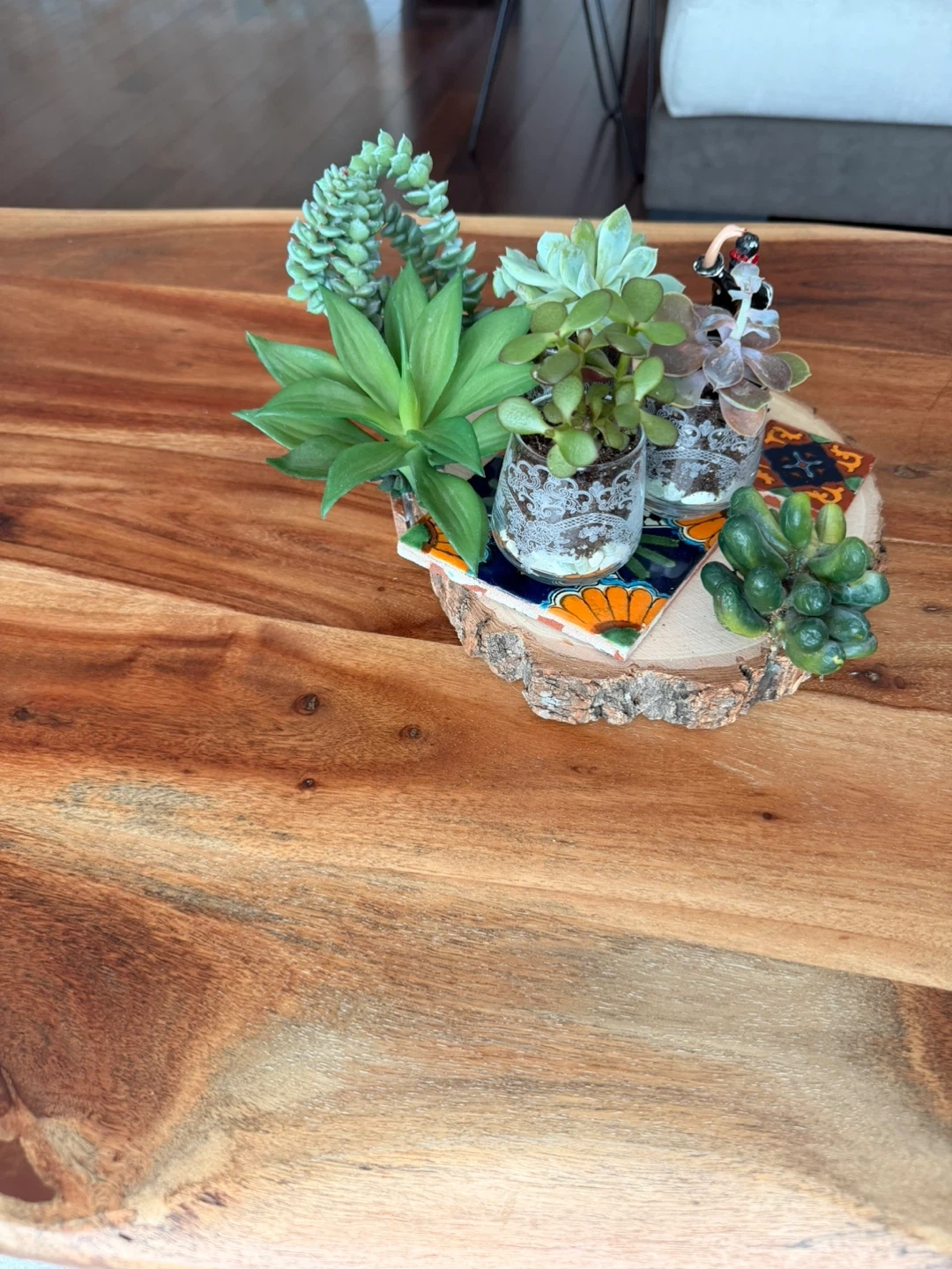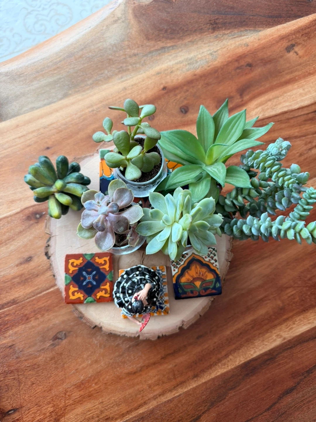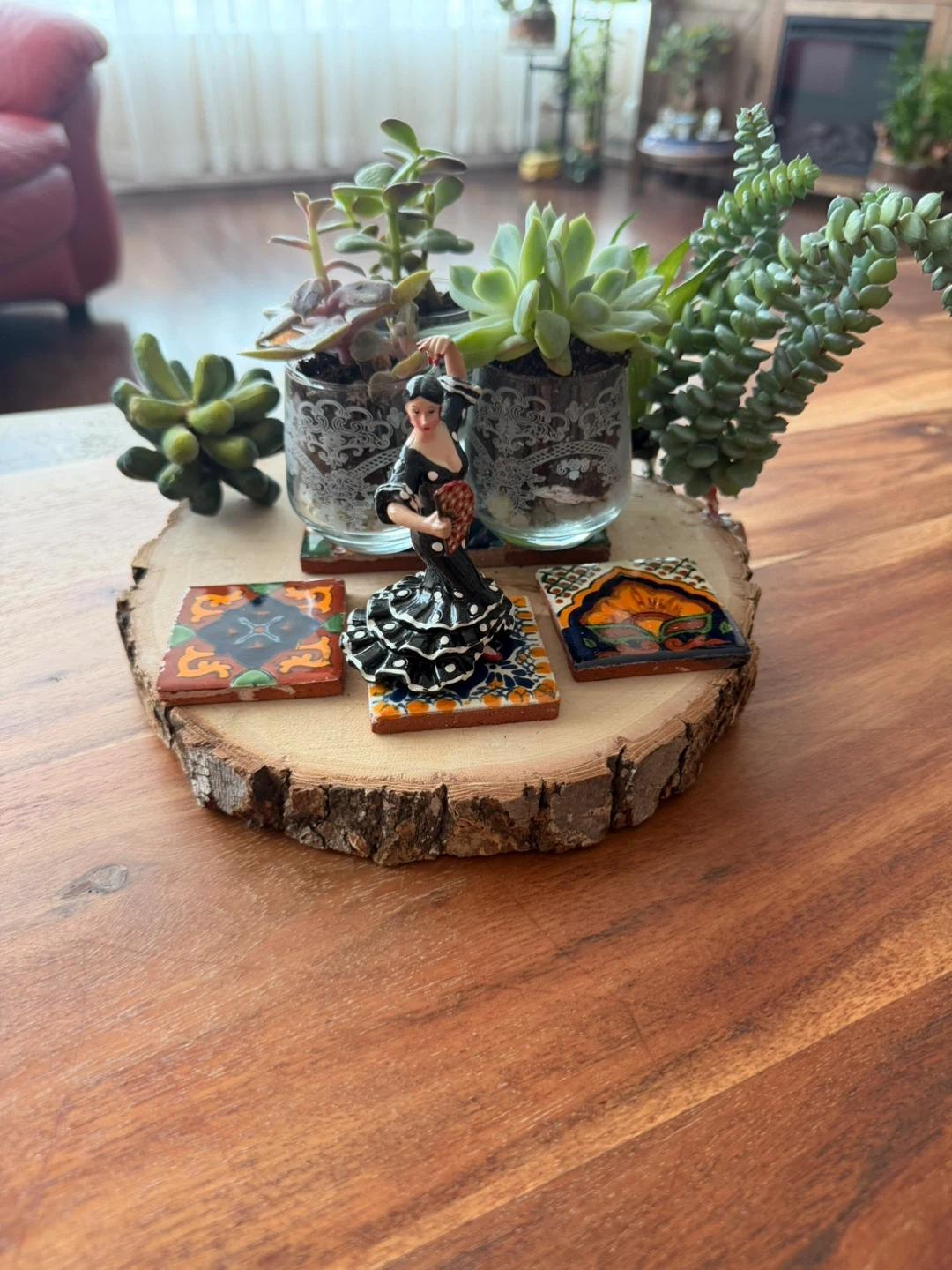This is a beautiful succulent planter centerpiece that would look great on any table! It features a variety of succulents planted in clear glass containers, arranged on a wooden slice with decorative tiles and a small flamenco dancer figurine