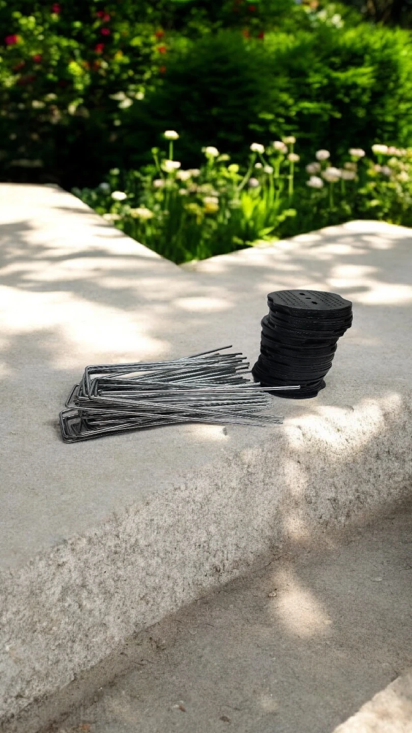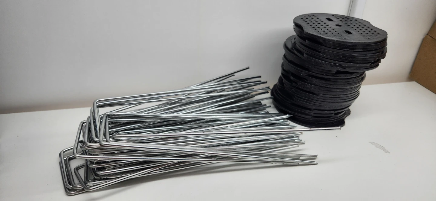 Here are some garden stakes and weed barrier discs that I'm hoping to find a new home for! They are in great condition and ready to be used in your garden 38 gaskets and 45 pins great for securing grass sod fabric weeds tents tarps etc....