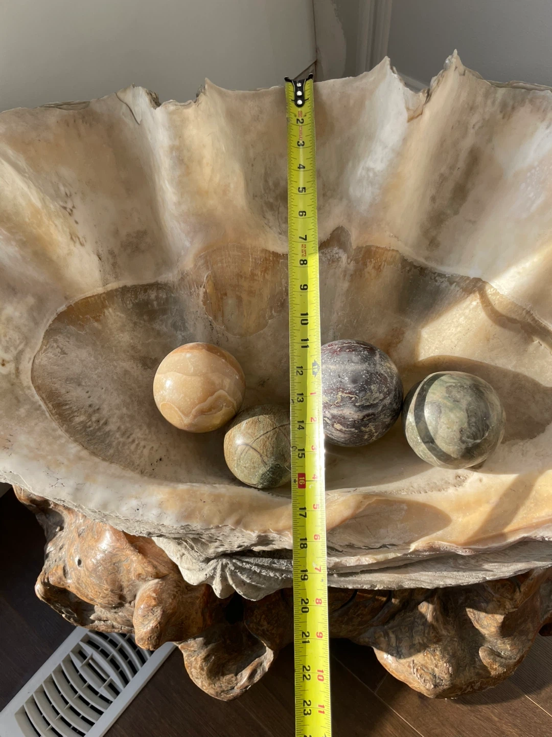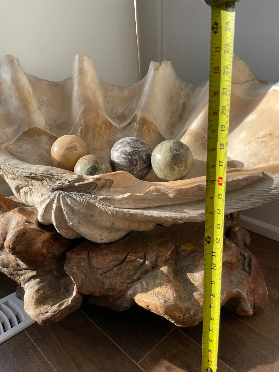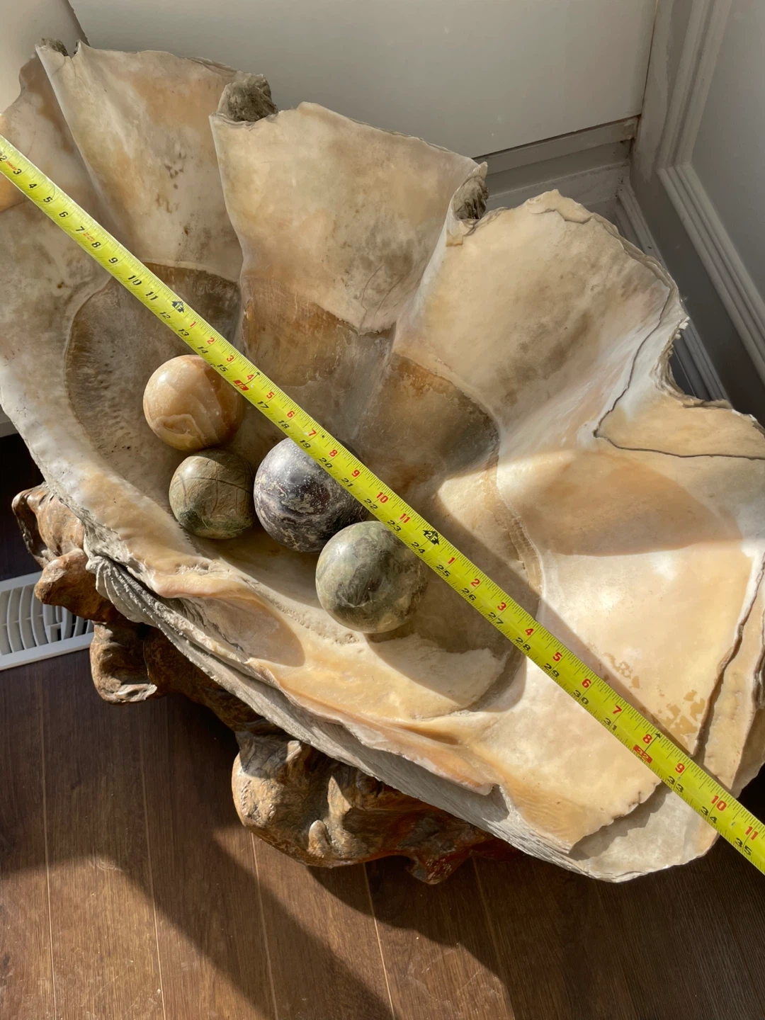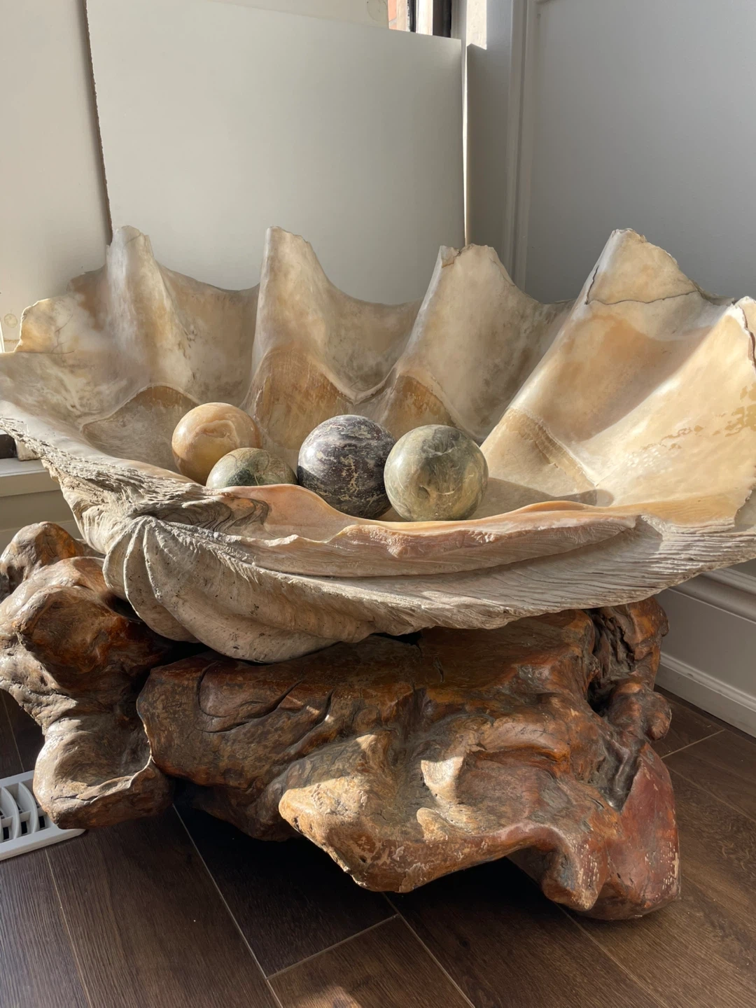 Selling a decorative Giant clam shell with a set of stone balls. The shell measures approximately 34 1/2 inches in length and 24 inches in height. It makes a unique statement piece for any room.