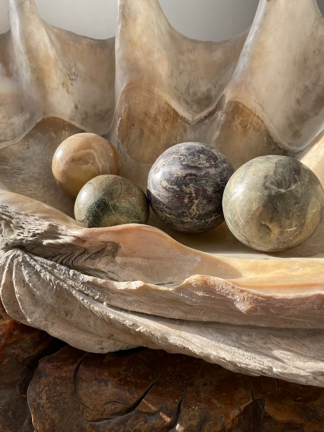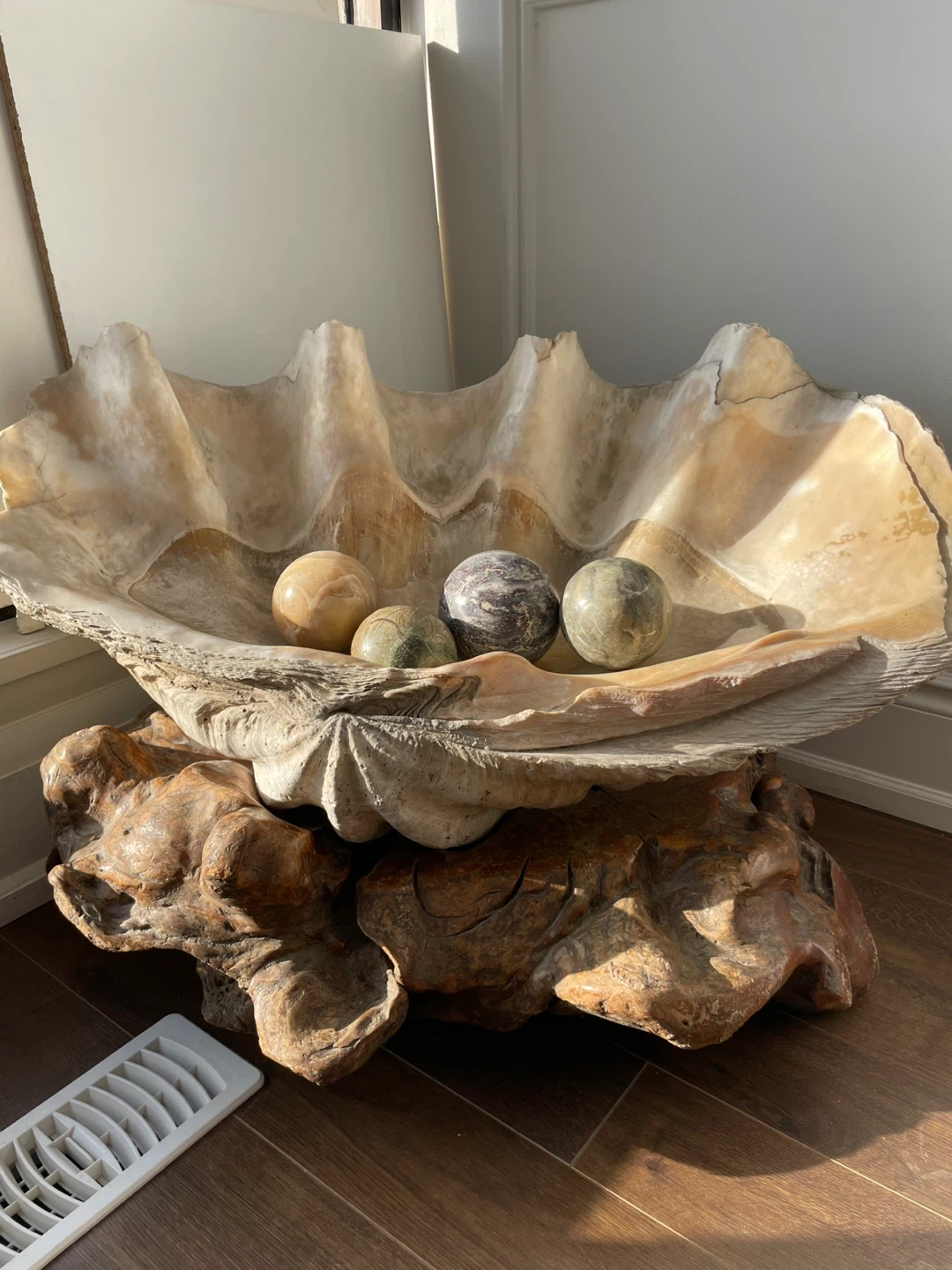 Selling a decorative Giant clam shell with a set of stone balls. The shell measures approximately 34 1/2 inches in length and 24 inches in height. It makes a unique statement piece for any room.