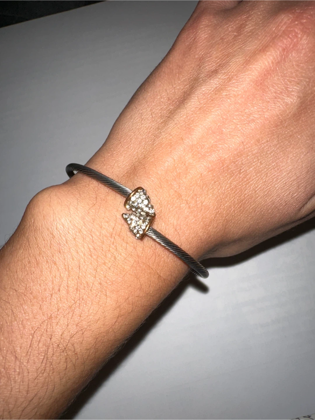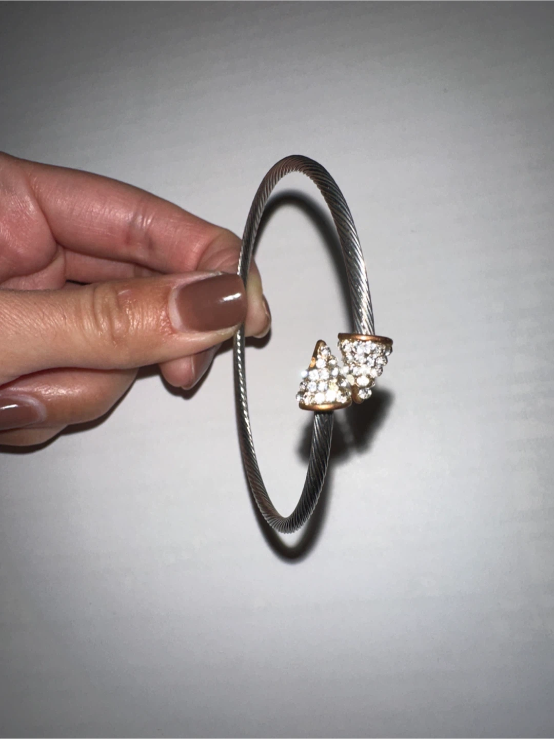 Selling a stylish silver-tone bangle bracelet. It features a unique design with decorative accents. Perfect for adding a touch of elegance to any outfit
