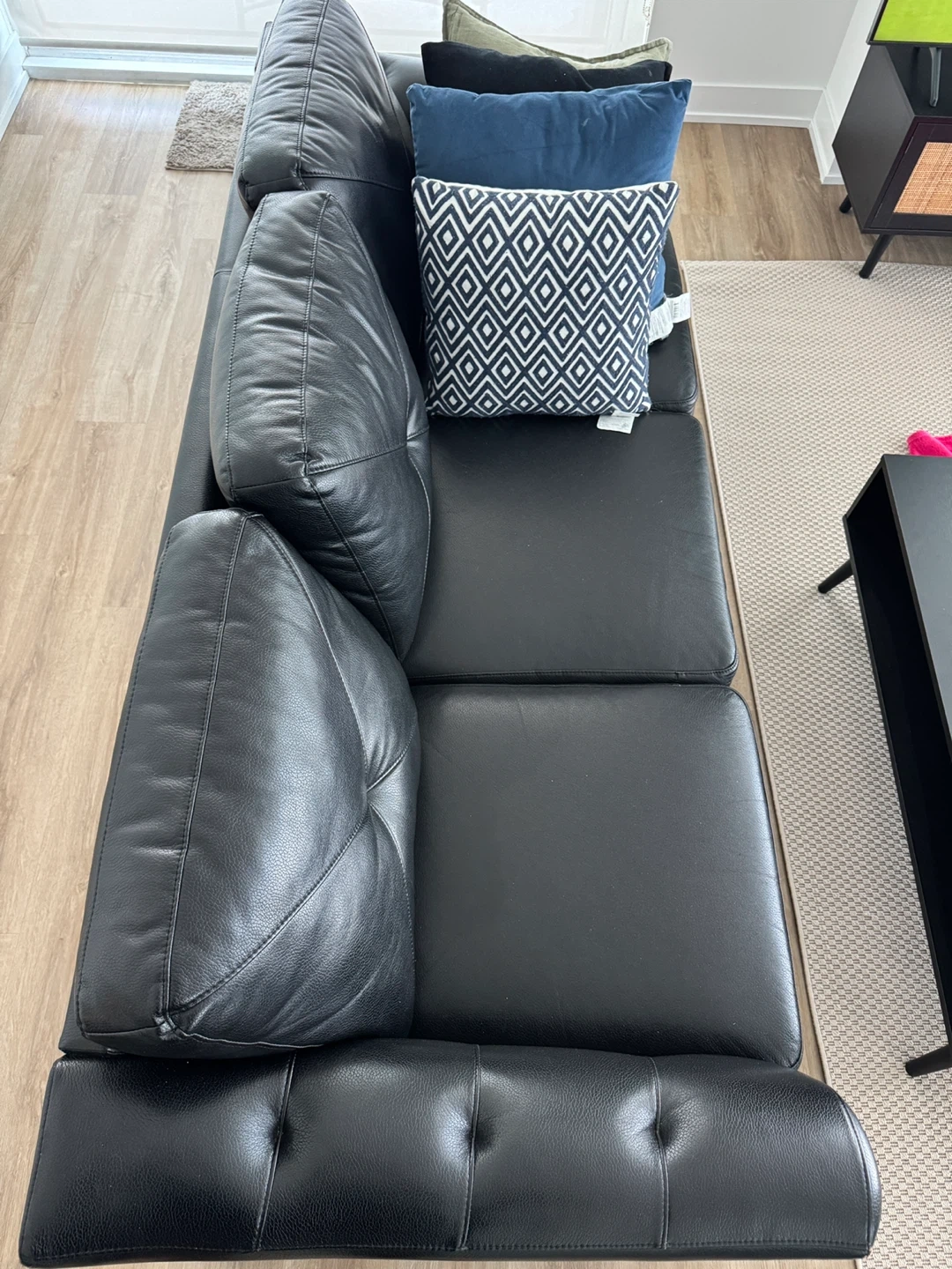 Selling a comfortable black leather sofa. It's in good condition and perfect for a living room or den. The sofa features a classic design.
