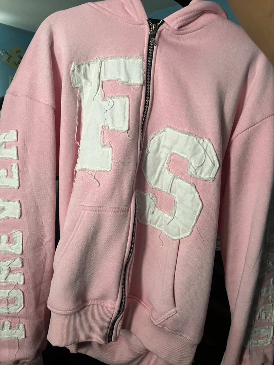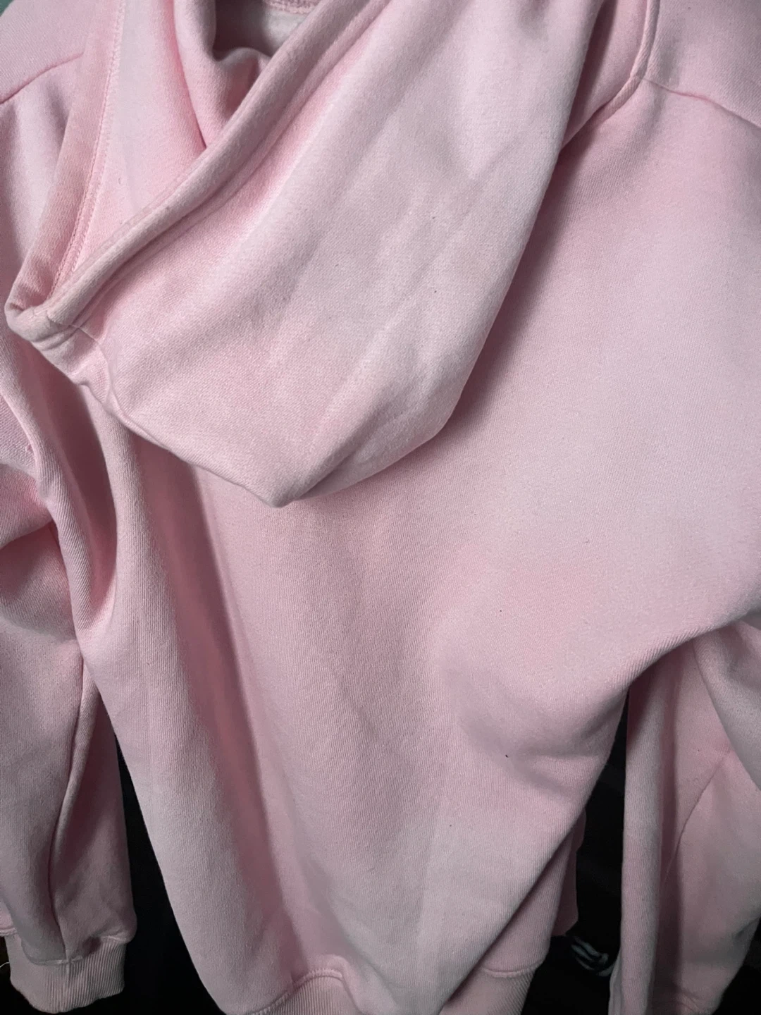 Selling a cute pink hoodie with a full zipper! It has white lettering on the front and sleeves. Perfect for layering or just lounging around