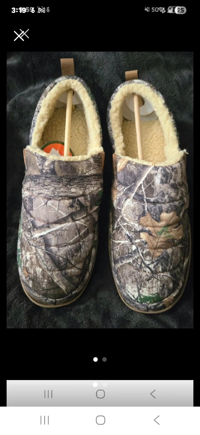 Ozark slippers in a camo pattern, perfect for keeping your feet warm and comfortable around the house! They are size 9-10.
