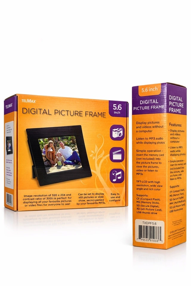 Display your cherished memories on this Telmax 5.6 inch digital picture frame, featuring a 320 x 234 resolution and 300:1 contrast ratio for clear and vibrant viewing. This used digital frame allows you to showcase your favourite pictures and videos without needing a computer, and even lets you listen to MP3s.