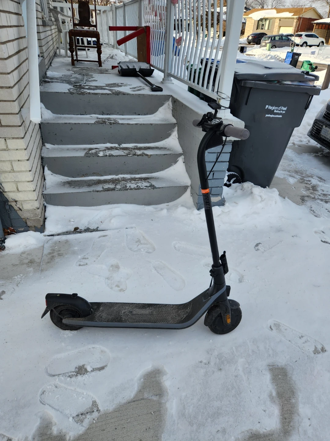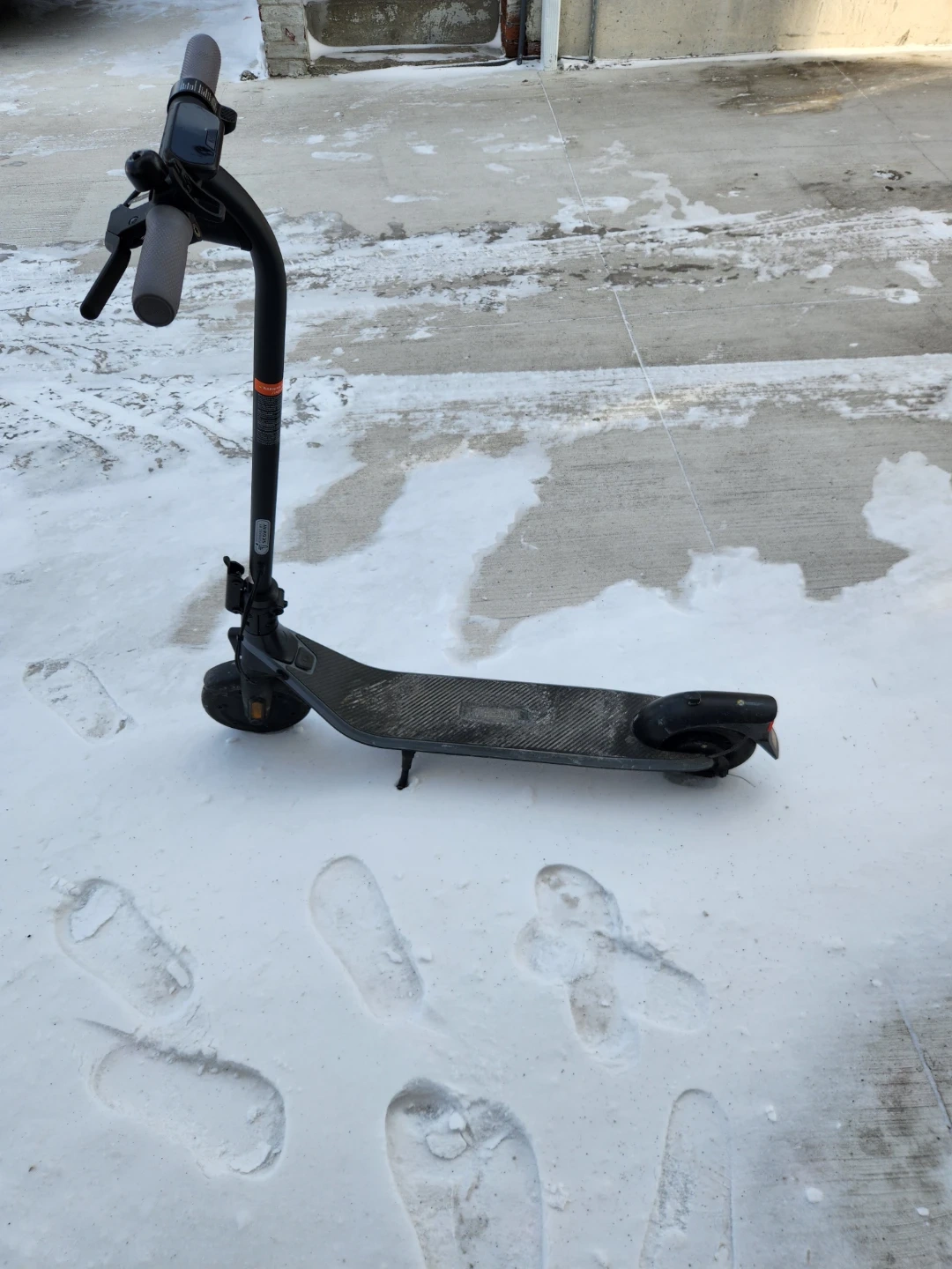 Selling a Segway Ninebot ES1 electric scooter in black. It's in good condition and ready for some fun rides! It's lightweight and portable, making it easy to carry around. Great for getting around town!