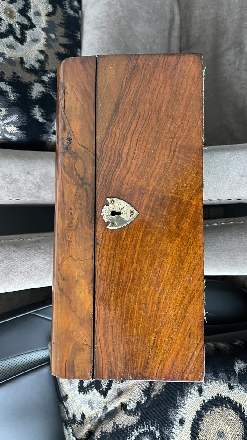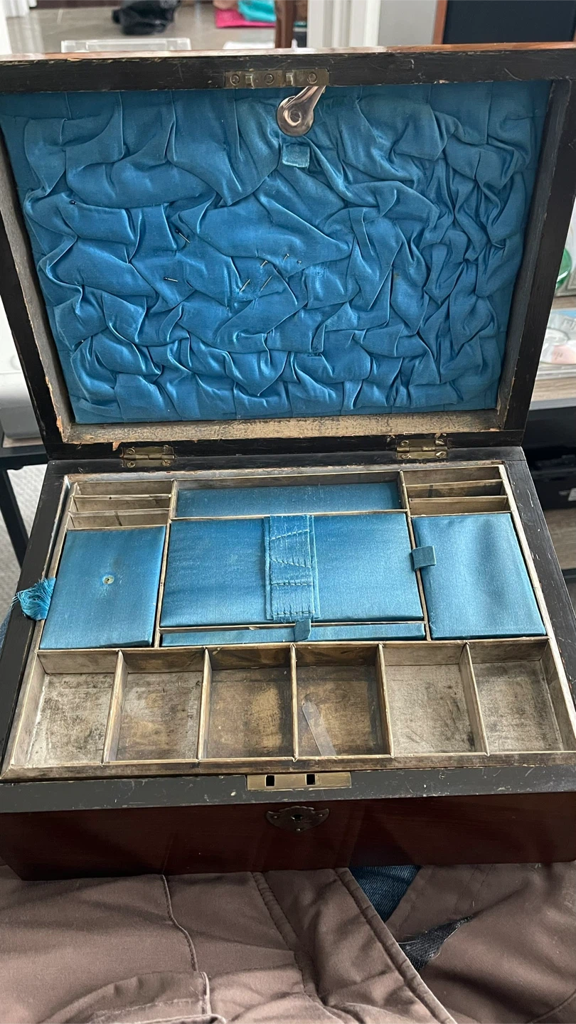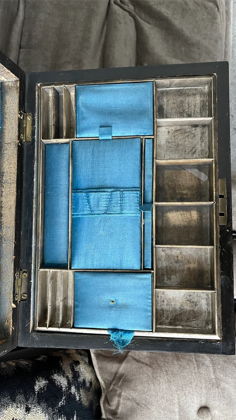 Antique Victorian rosewood jewellery / sewing / letter / storage box with rosewood lift up lid opening to reveal a fitted blue silk interior and a storage compartments - including for letters and sewing needles with beautiful original metal key hole escutcheon. Includes what is possibly the original sewing needle in one pic.