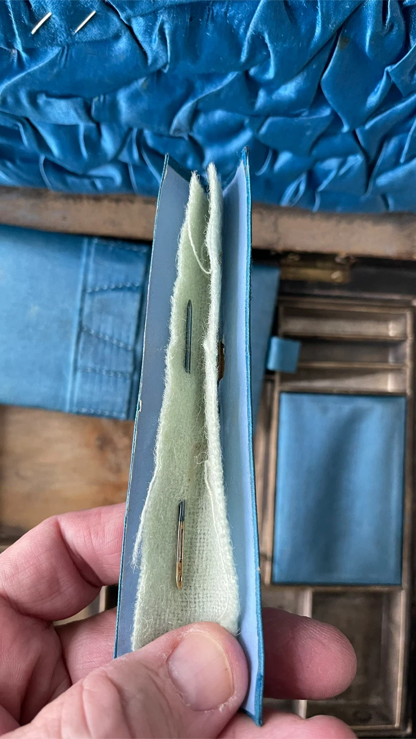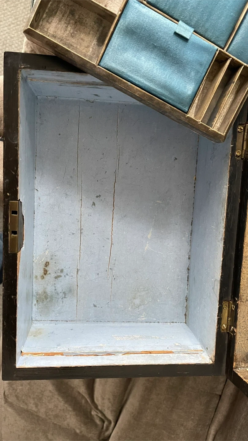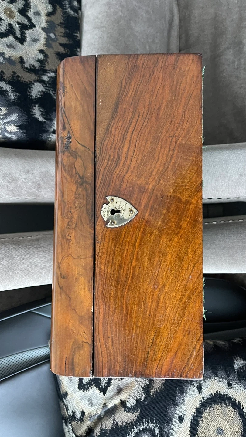 Antique Victorian rosewood jewellery / sewing / letter / storage box with rosewood lift up lid opening to reveal a fitted blue silk interior and a storage compartments - including for letters and sewing needles with beautiful original metal key hole escutcheon. Includes what is possibly the original sewing needle in one pic.