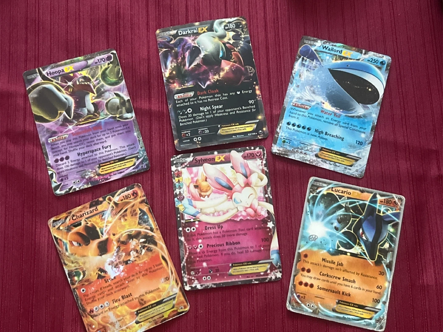 Selling a set of Pokémon EX cards! Includes Hoopa EX, Darkrai EX, Wailord EX, Charizard EX, Sylveon EX, and Lucario EX. Great for collectors or players looking to add some powerful cards to their deck. Ask for individual prices if only looking to buy 1.