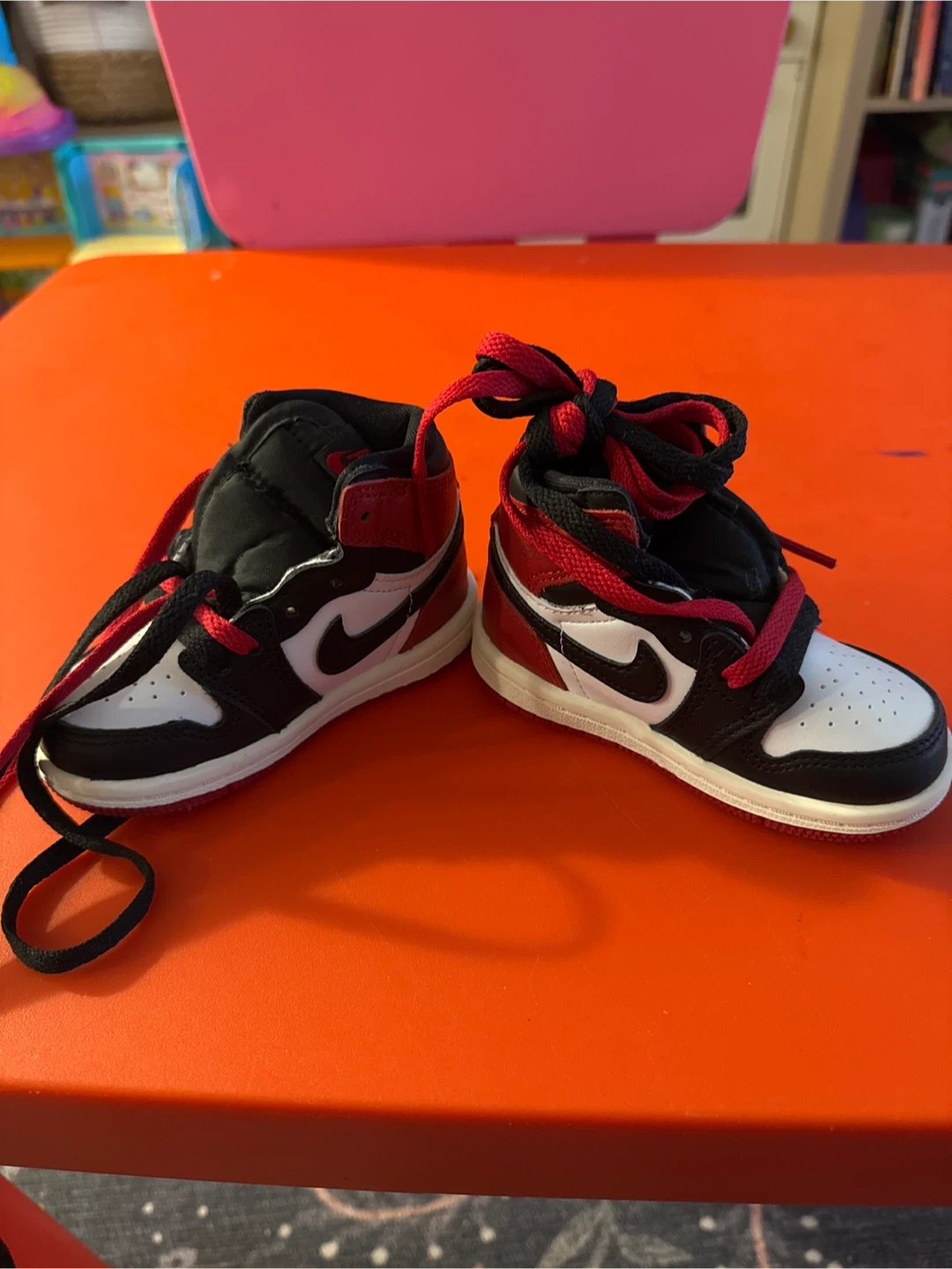 These are a pair of brand new toddler sized Air Jordan 1s! Size is 5C .They have a classic black, white, and red colorway. Perfect for your little one to step out in style. Retail for $65 - will sell for $30