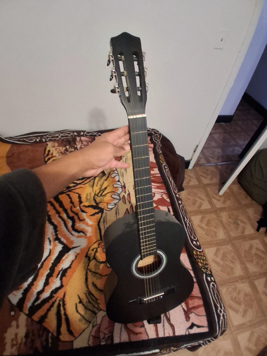 Selling a black acoustic guitar. It appears to be in good condition and ready to play! Perfect for beginners or anyone looking for a simple acoustic guitar. Spare guitar strings included.