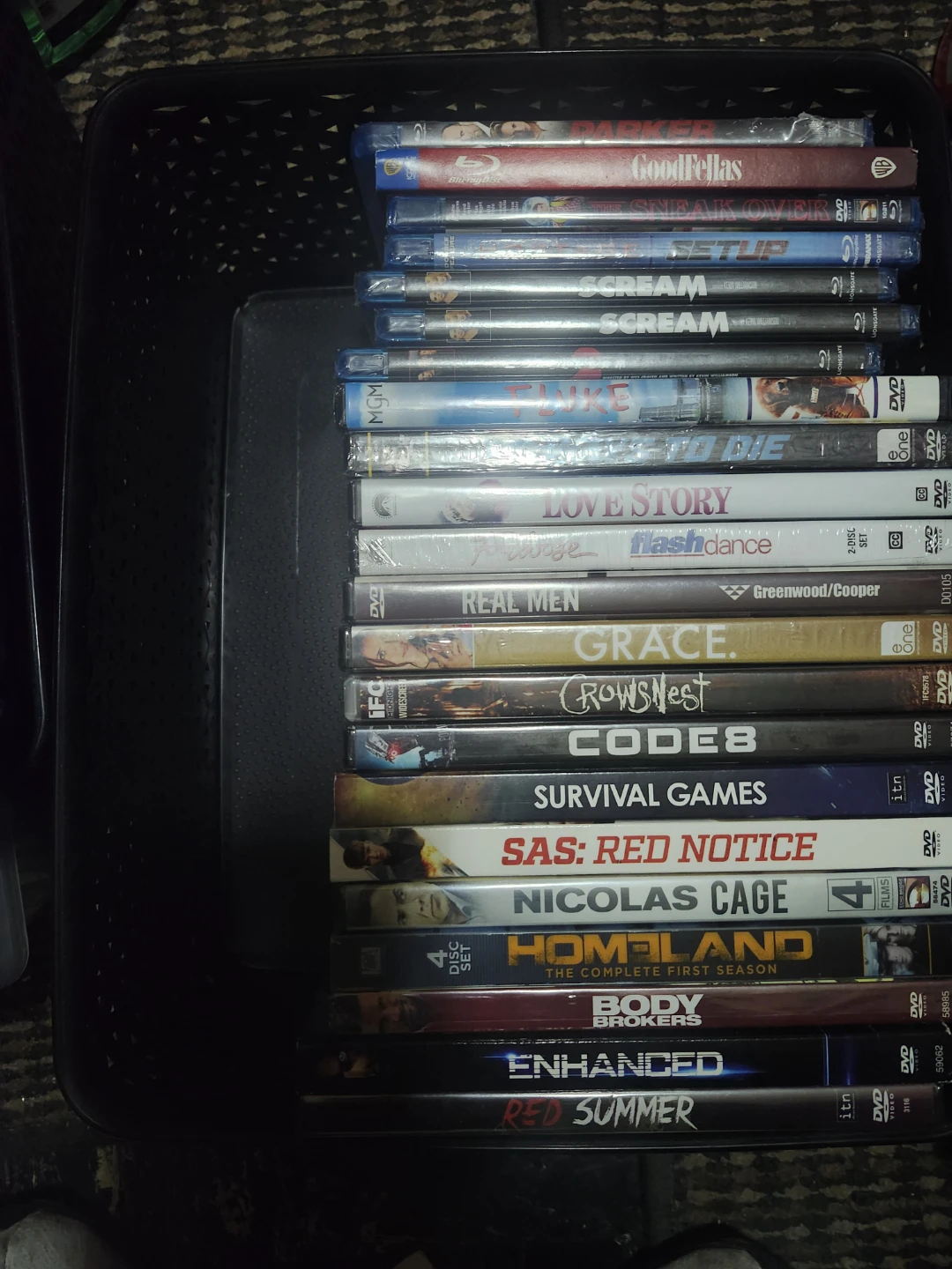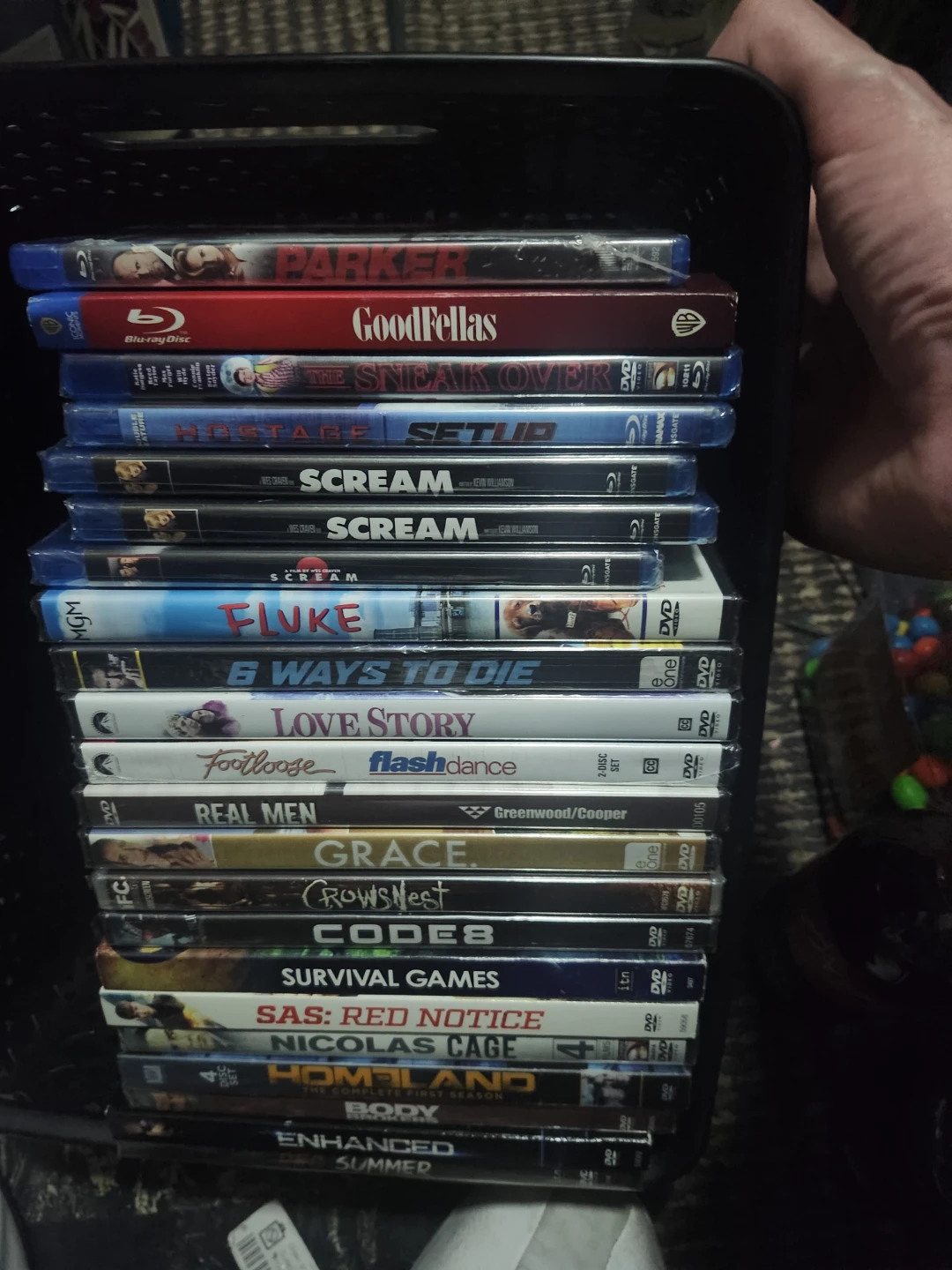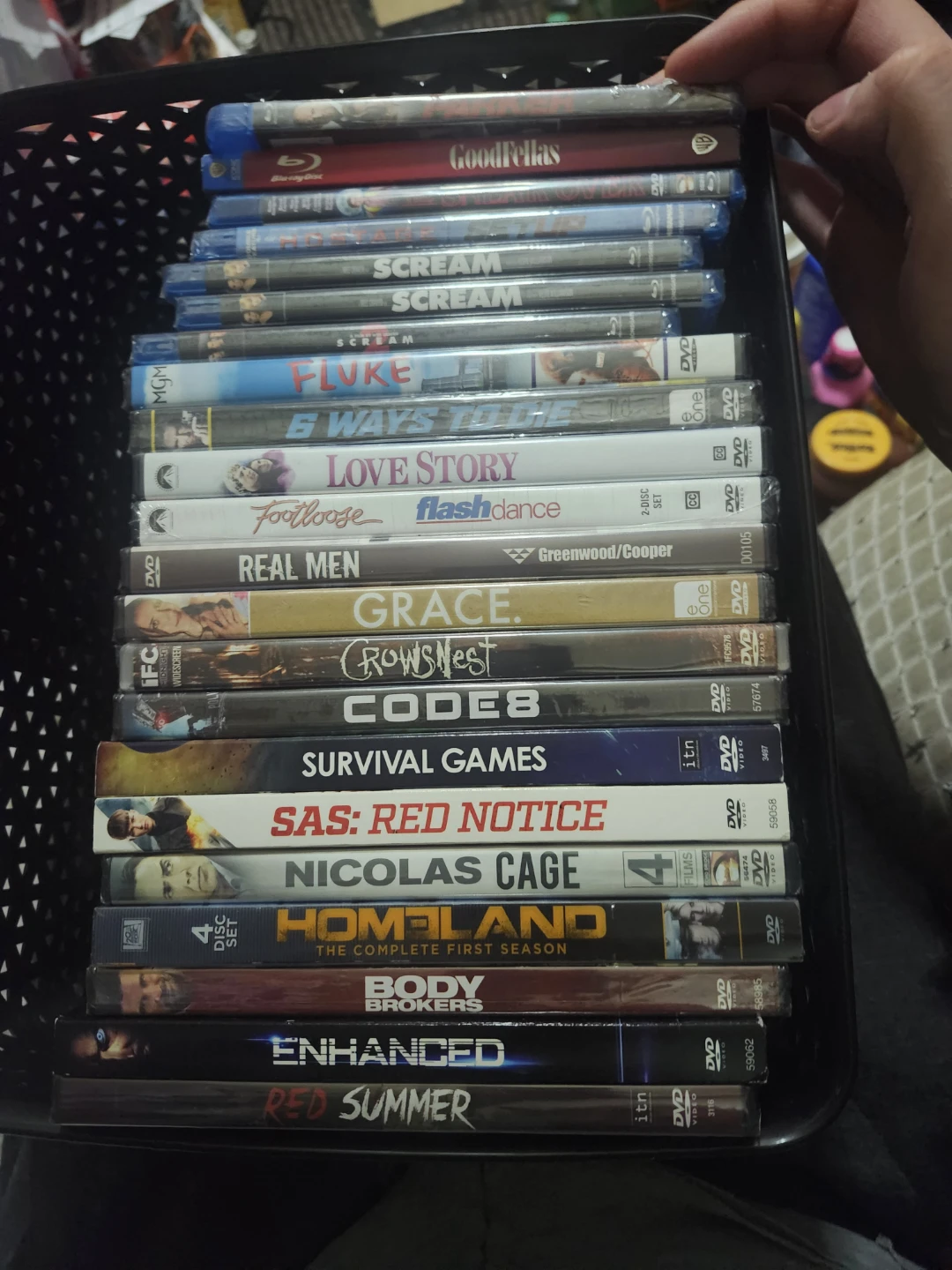 Selling a DVD/Blu-ray movie collection featuring a variety of titles. Includes movies like Goodfellas, Scream, Fluke, Love Story, Footloose, Real Men, Grace, Code 8, Survival Games, SAS: Red Notice, Nicolas Cage, Homeland, Body Brokers, Enhanced, and Red Summer. Grab this collection for your movie nights