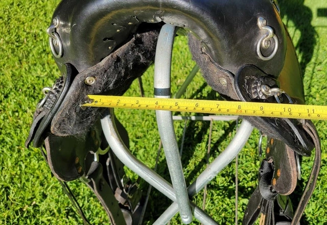Absolutely beautiful and very comfortable saddle with buttery-soft leather, very high quality made by Jay's Custom Saddlery in Monterey Tennessee. 16" seat with 25" overall skirt length, fits a wide variety of equines except those with super straight backs and mutton withers. Features: * Thinner bars for closer contact with relief channels for better leg movement; * Custom designed bar for better shoulder and wither relief allowing for better performance; * Full Grain Hermann Oak Leather; * Saddle Tree is Kiln-dried yellow poplar wood covered in Fiberglass, which is lighter than pine and provides more strength & durability. This saddle has seen very little use and has been meticulously cared for in it's short life. Measurements in photos. Trials available with full payment up front and full refund if it doesn't fit (provided it returns in the same condition). Pick up near Stayner.