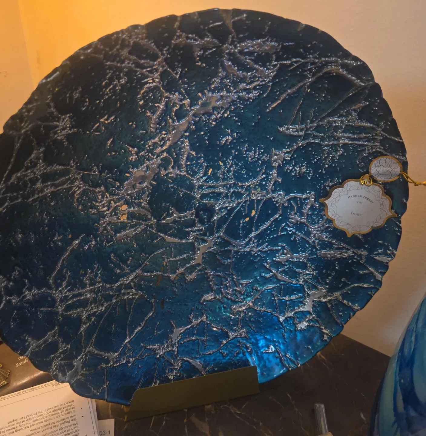 Beautiful decorative plate, made in Turkey! It features a unique design with silver accents on a blue background. Perfect for adding a touch of elegance to any room
