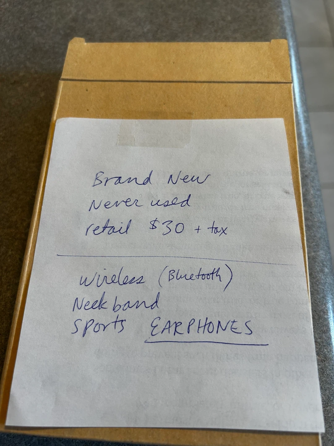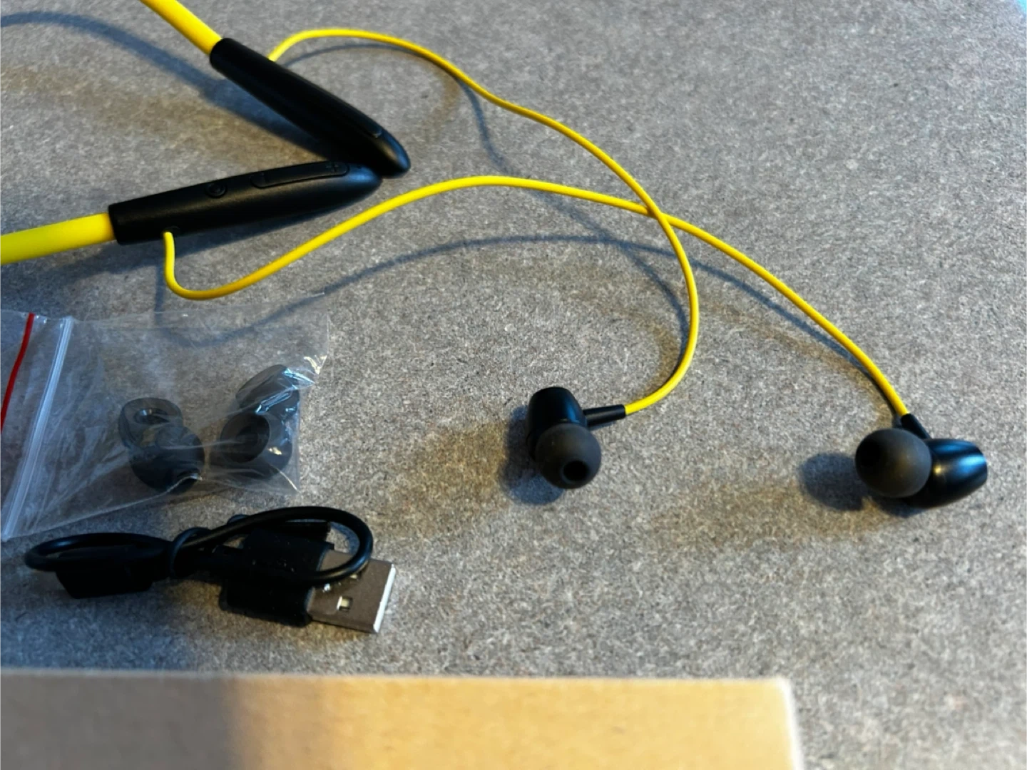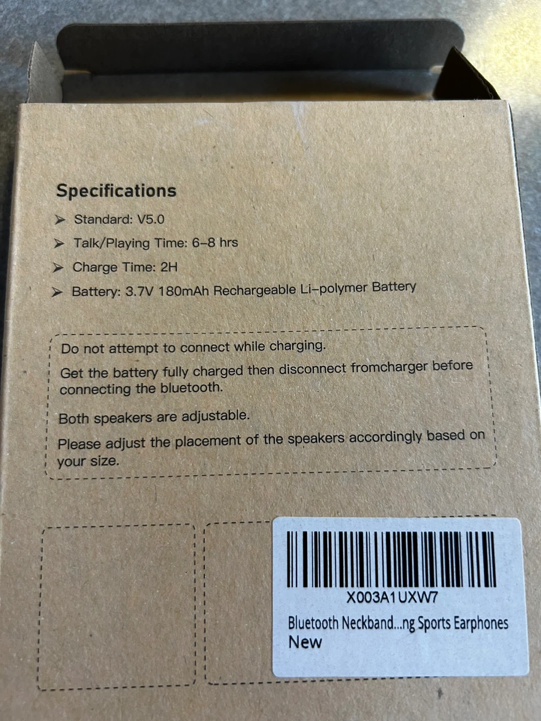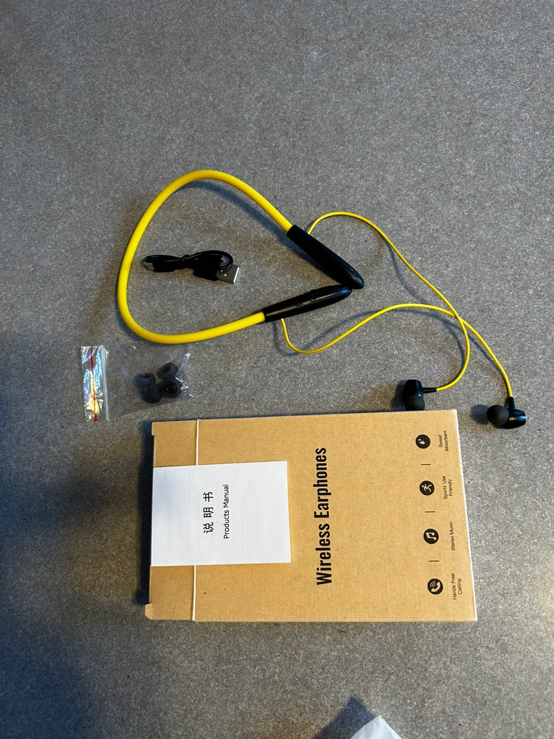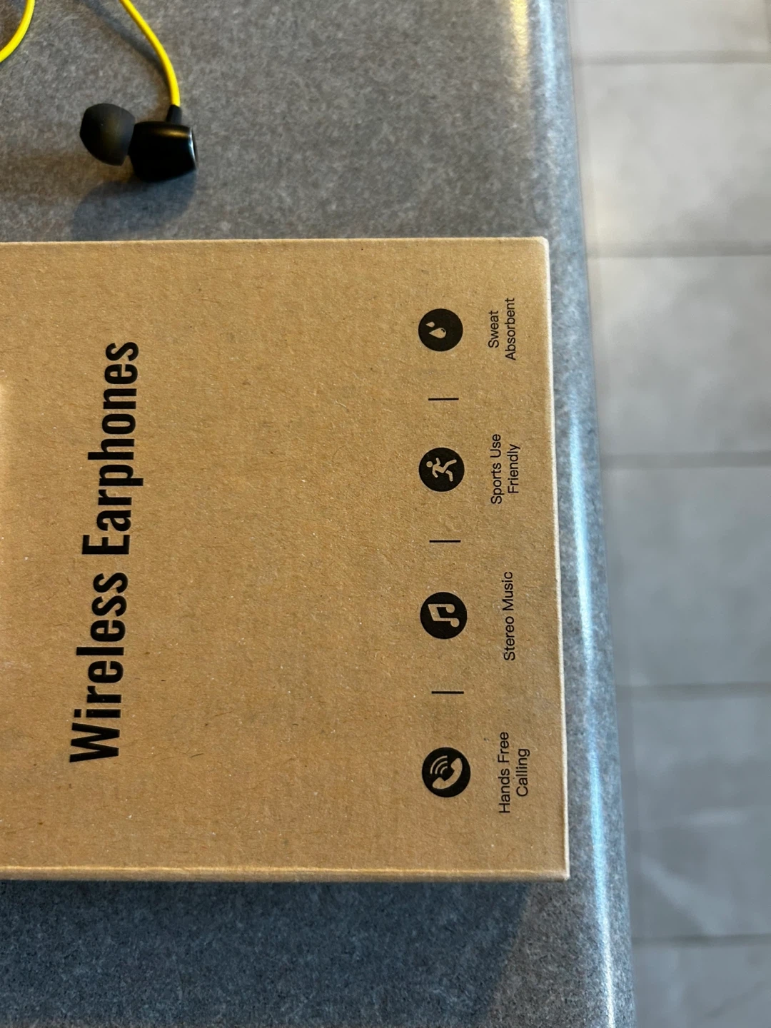 Wireless neckband sports earphones are brand new and have never been used! They come with the original box and accessories, including extra earbud tips and a charging cable. The box says these are sweat absorbent, sports use friendly, and great for stereo music and hands-free calling. Originally retailed for $30 plus tax