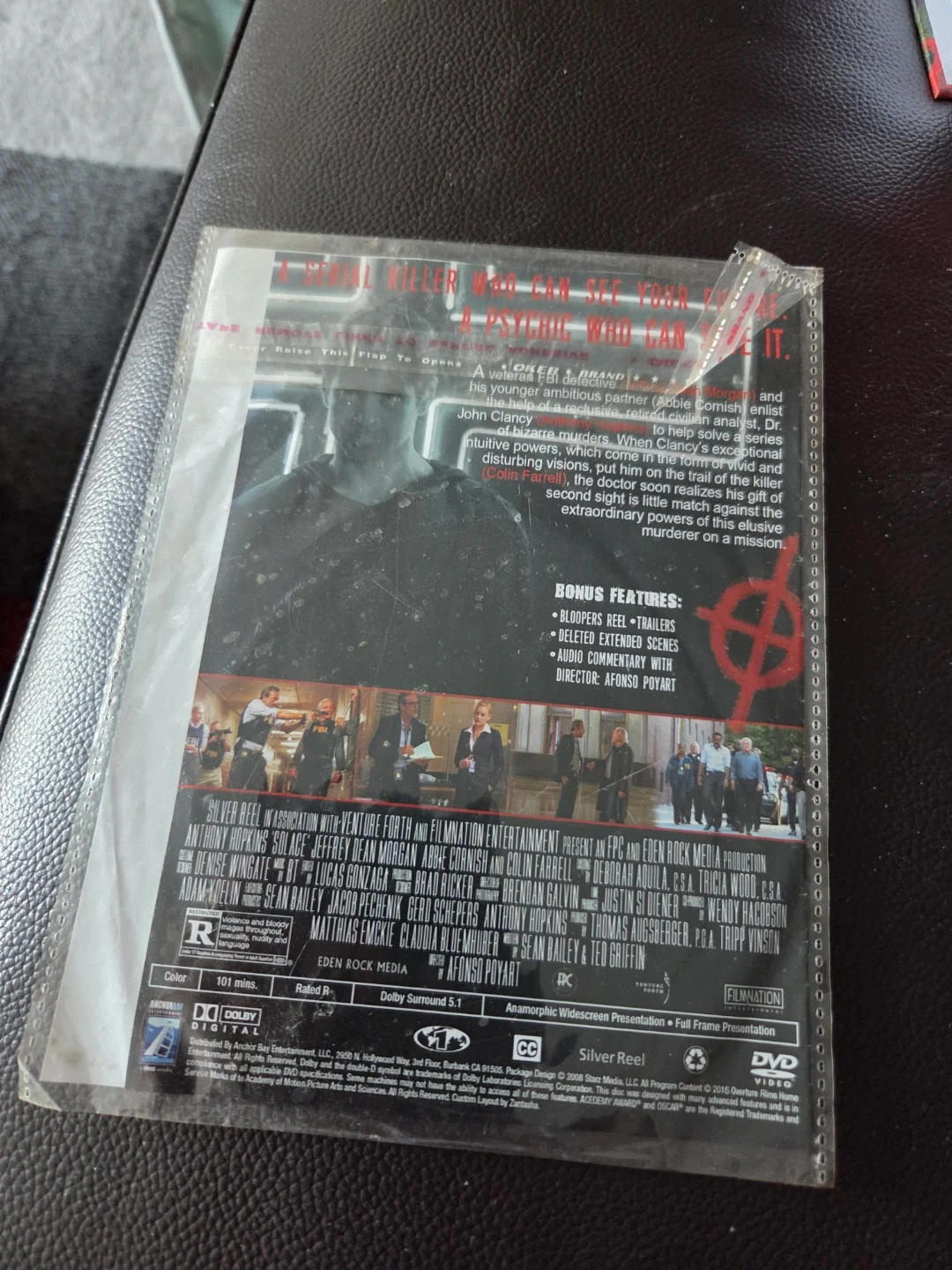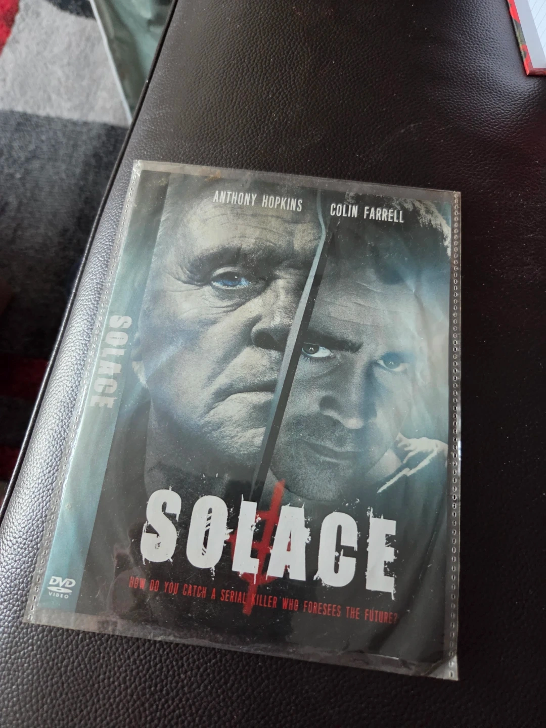 Selling the DVD movie Solace, starring Anthony Hopkins and Colin Farrell. It's a thriller about catching a serial killer who foresees the future. Features bonus content like bloopers, trailers, and a director's commentary. New never used.