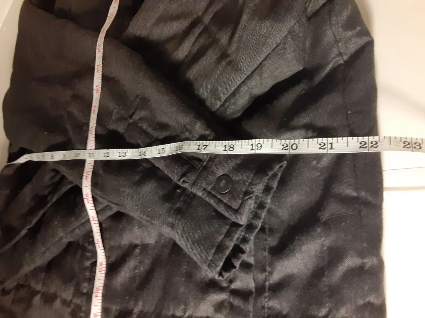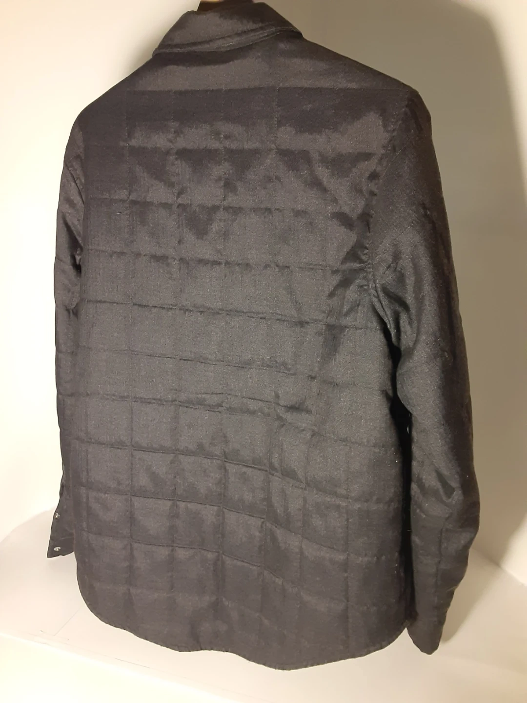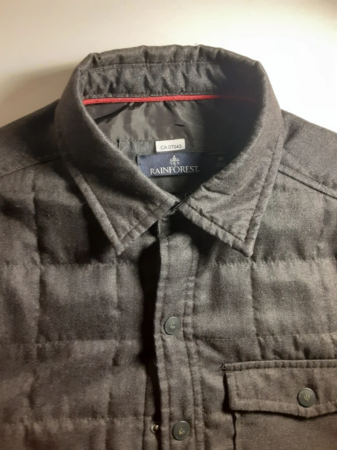 Rainforest - dark grey light quilted button up jacket(100% Polyester) in size medium! It's a stylish and comfortable piece, perfect for layering. Has a front button up top pocket and 2 standard side pockets, with no internal pockets. Shows sign of use/wear(mainly the buttons) but is still in good condition.