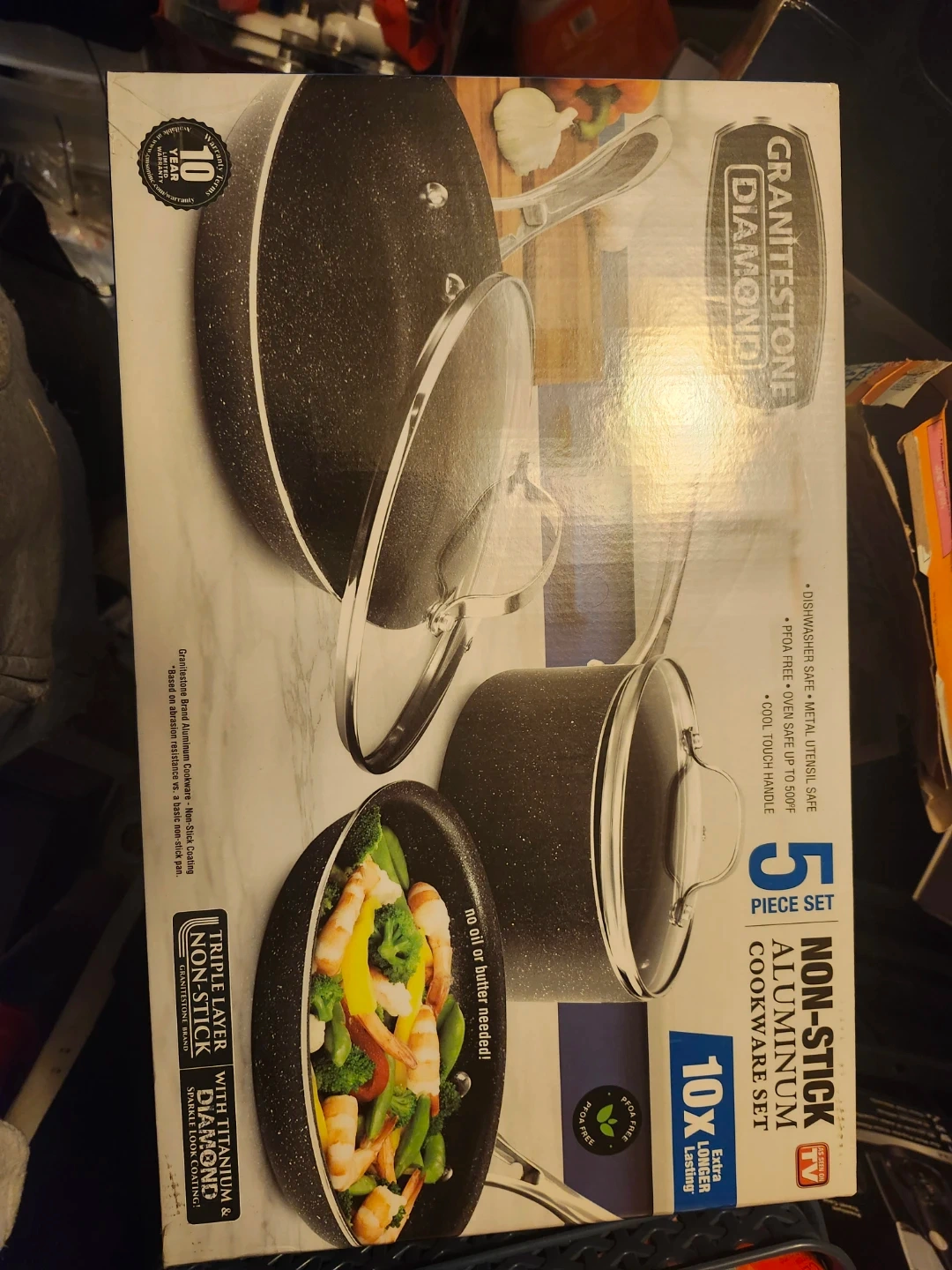 Selling a brand new Granitestone Diamond 5-piece cookware set! This non-stick aluminum cookware set features a triple-layer non-stick coating with titanium and diamond sparkle look coating.