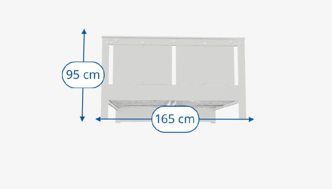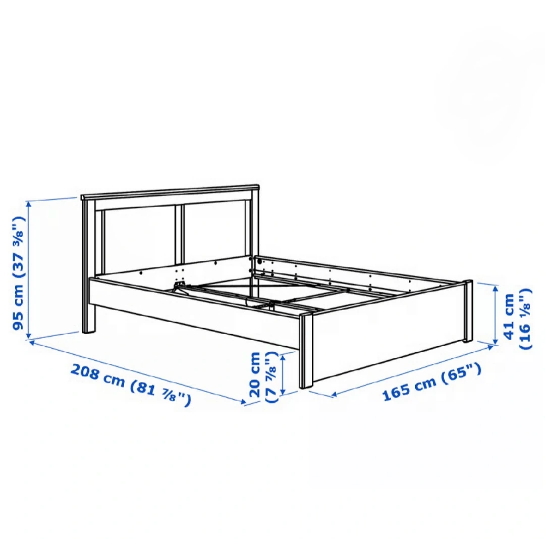 Selling a white bed frame. It's in great shape and ready for a new home. The dimensions are approximately 165 cm wide and 208 cm long. The headboard is 95 cm tall. Perfect for a queen-sized mattress!
