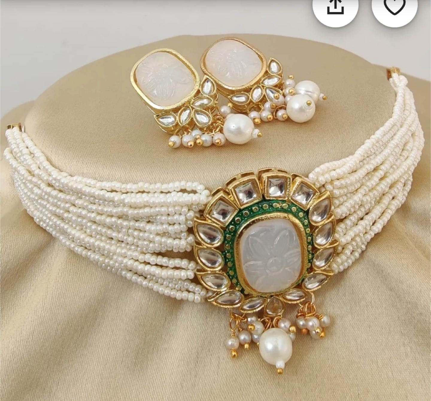Beautiful pearl choker necklace with matching earrings! The set features a white stone pendant and intricate gold detailing. Perfect for adding a touch of elegance to any outfit