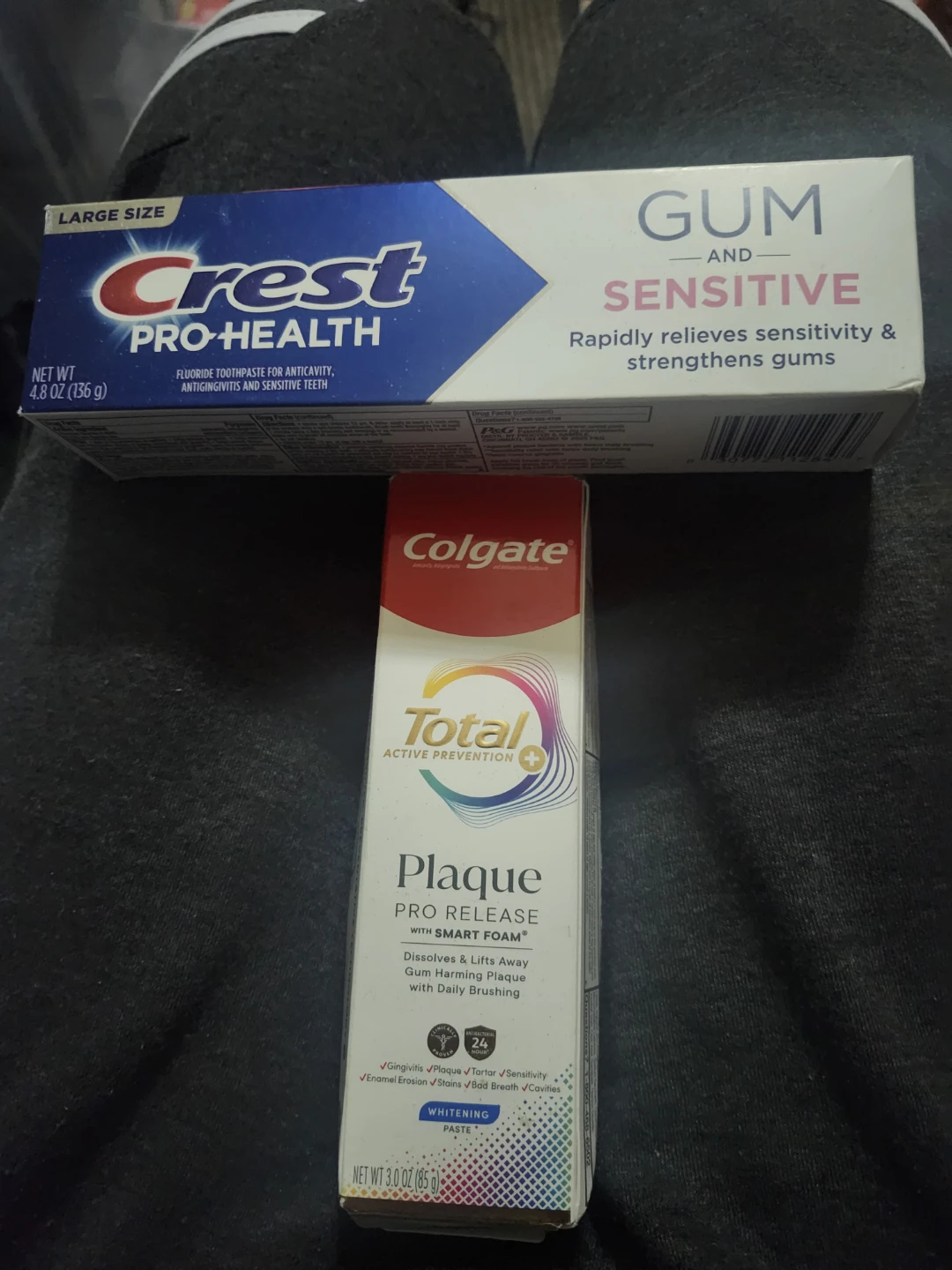Selling a large size Crest Pro-Health toothpaste (4.8 oz / 136 g) and a Colgate Total Active Prevention Plaque Pro Release toothpaste (3.0 oz / 85 g)