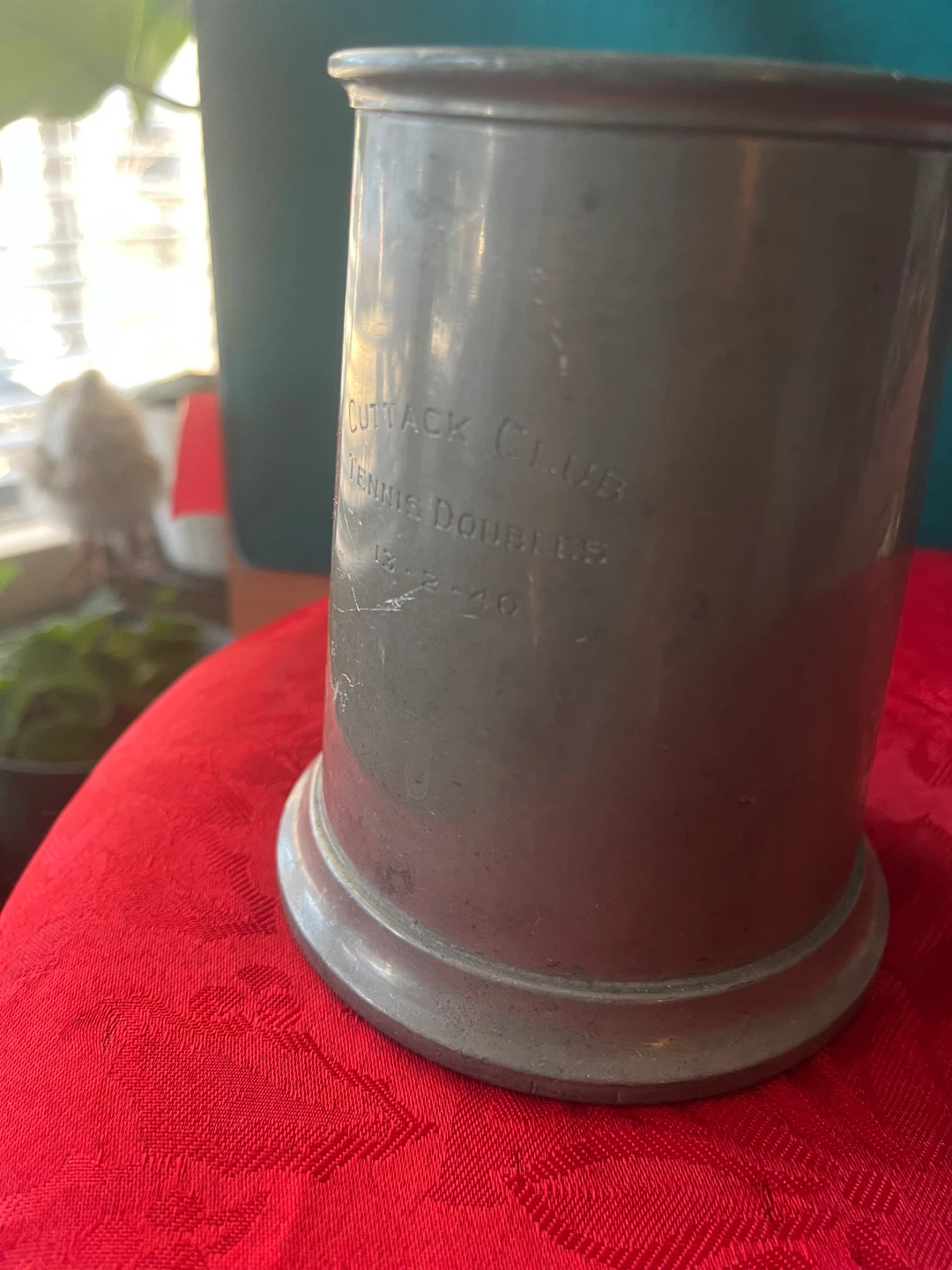 This is a vintage pewter glass bottom mug with “Cuttack Club Tennis Doubles 13-2-40” engraved on the side. It is 86 years old!