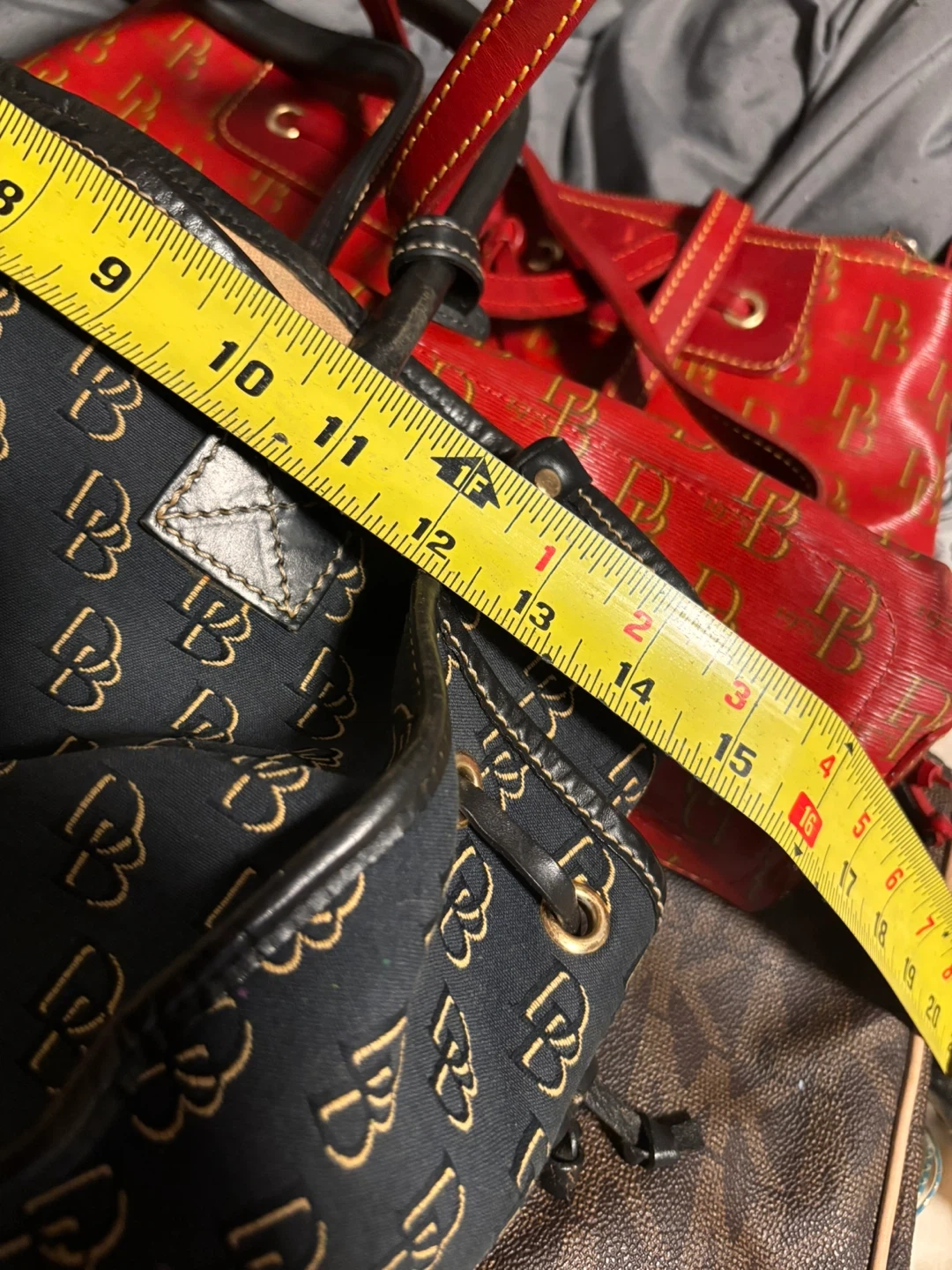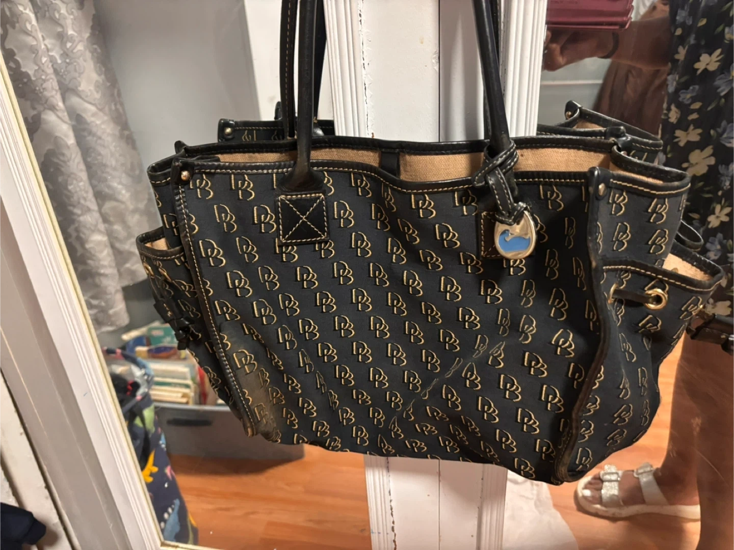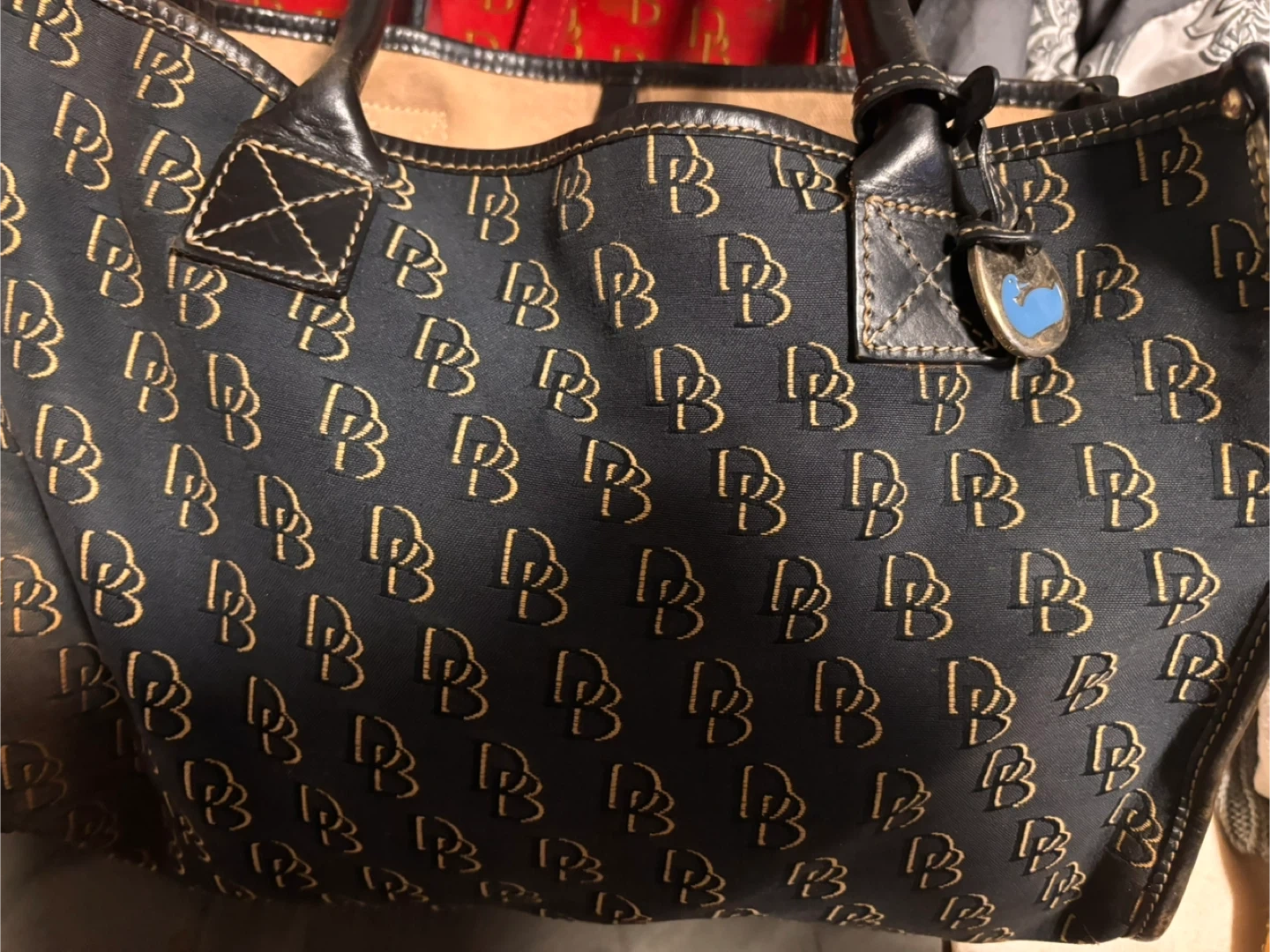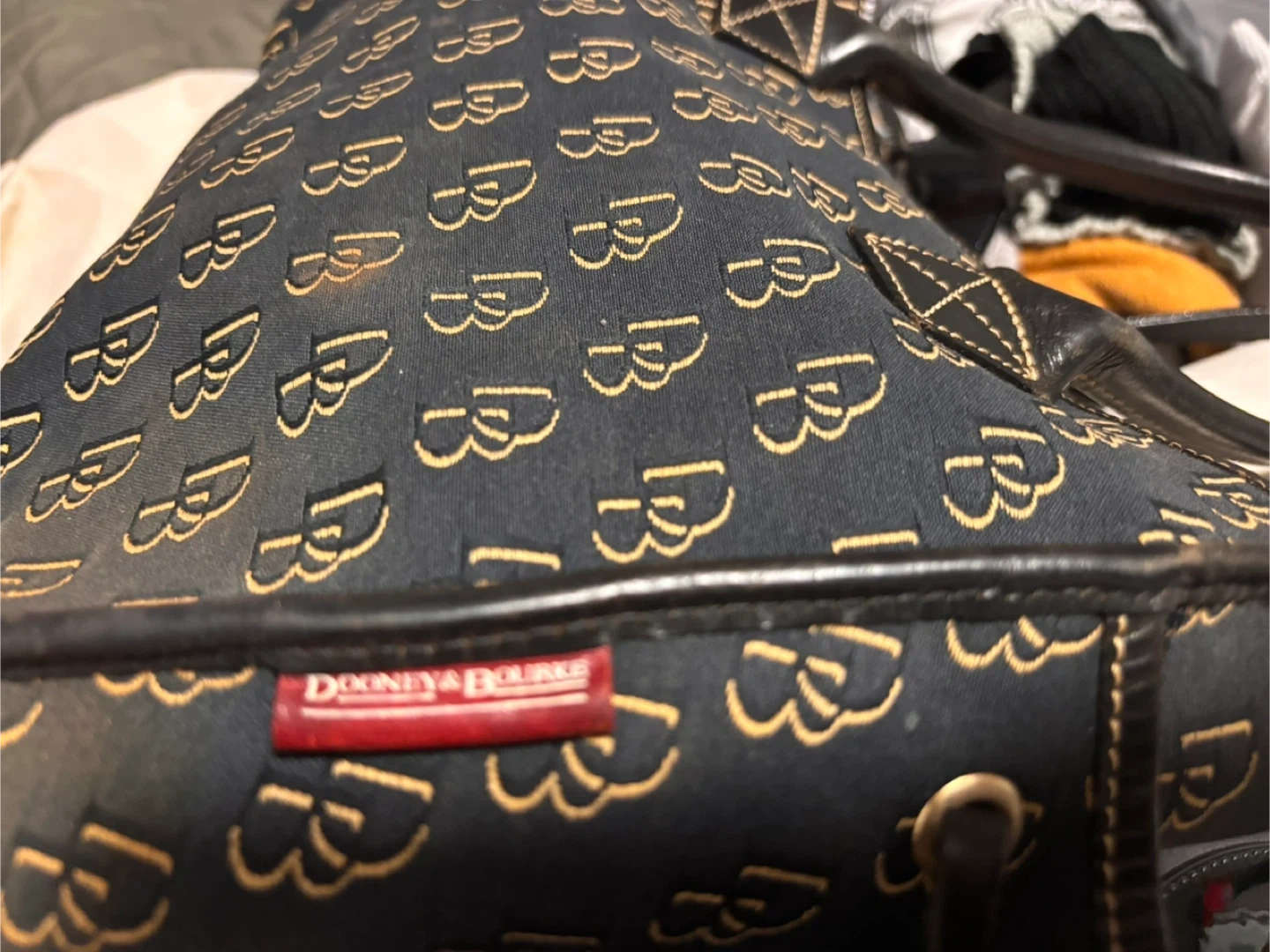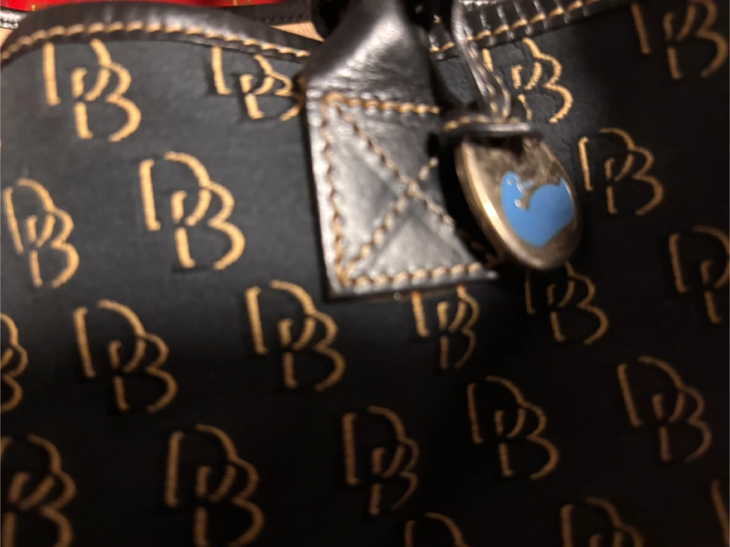Selling a Dooney & Bourke tote bag with a black background and brown DB pattern. It's in good condition and has leather trim and handles. The bag measures approximately 13 inches in length.