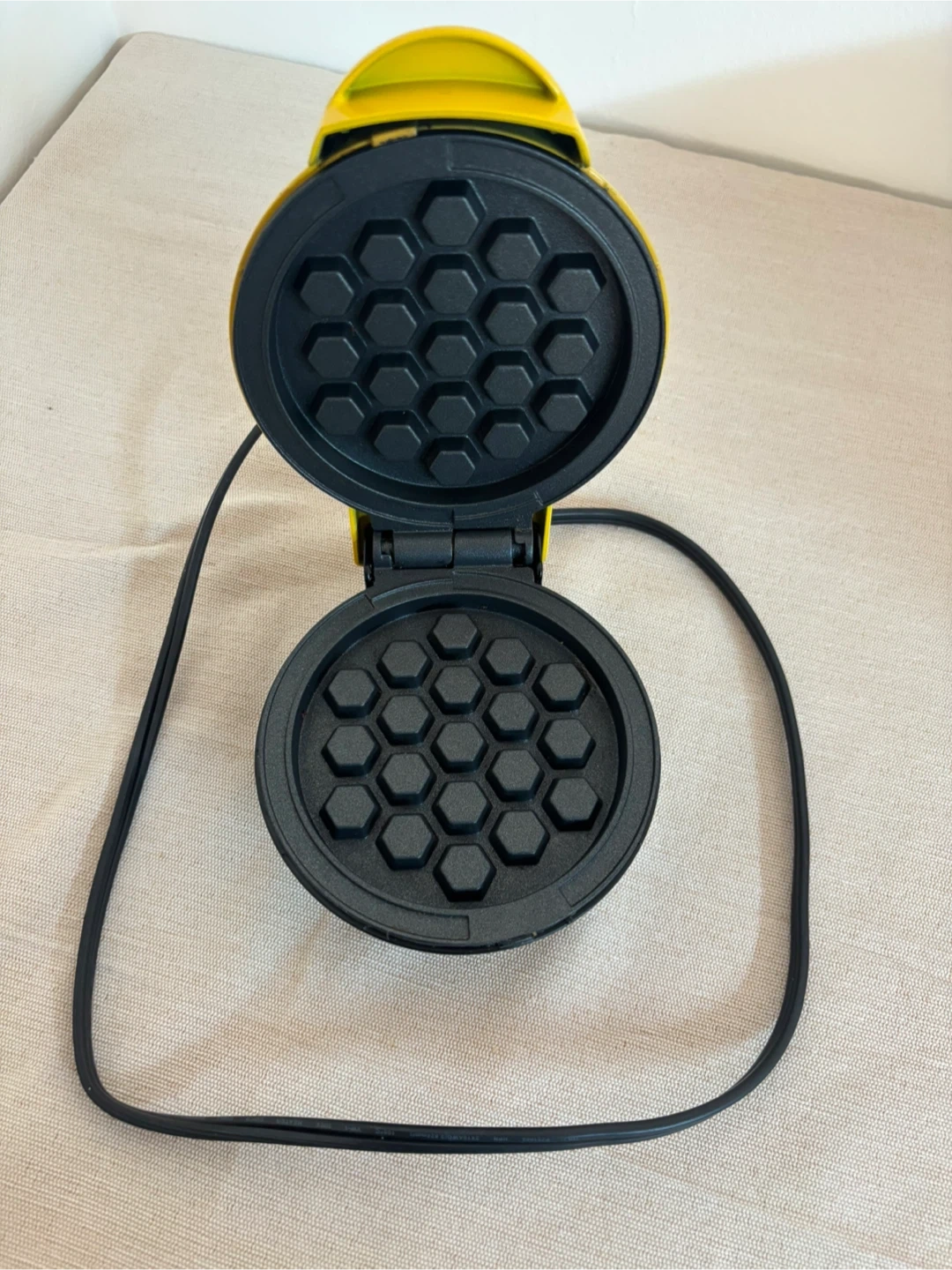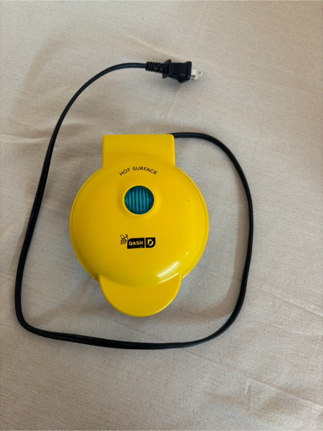 I'm selling a DASH mini waffle maker in yellow. (Honeycomb Waffle) It's perfect for making single-serve waffles, and its compact size makes it easy to store. It's great for small kitchens or anyone who wants a quick and easy breakfast!