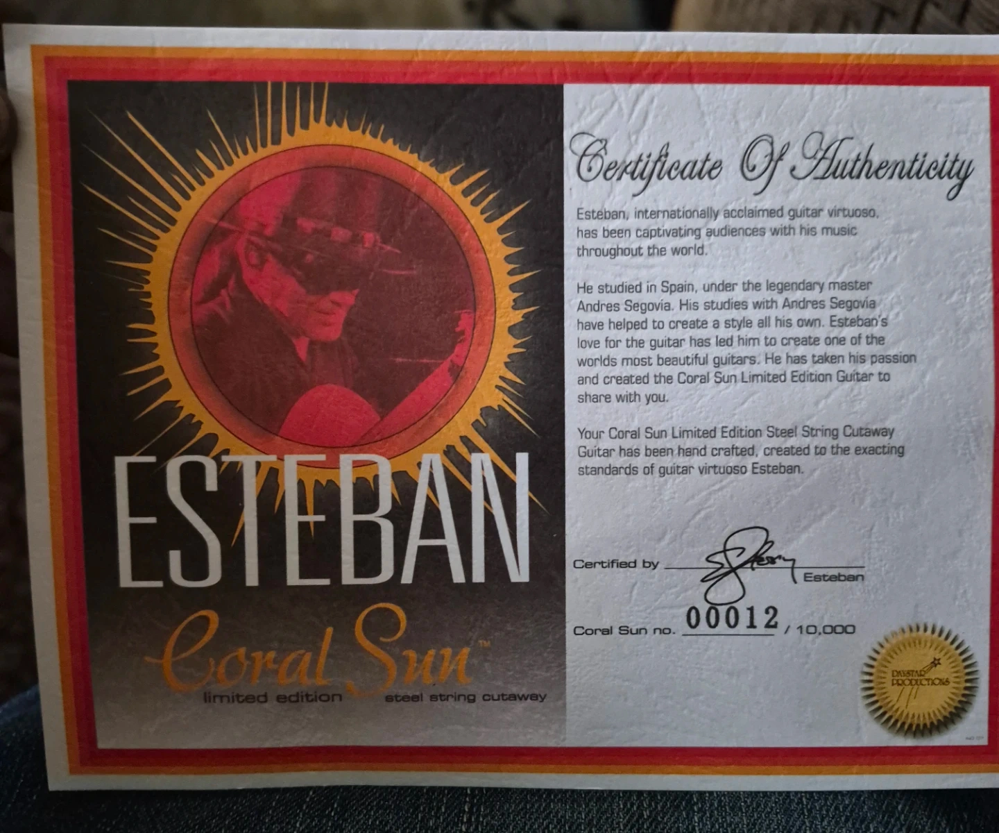 Selling an Esteban Coral Sun Limited Edition steel string cutaway guitar. It comes with its case and a certificate of authenticity. The guitar features a unique sun design and is in great condition