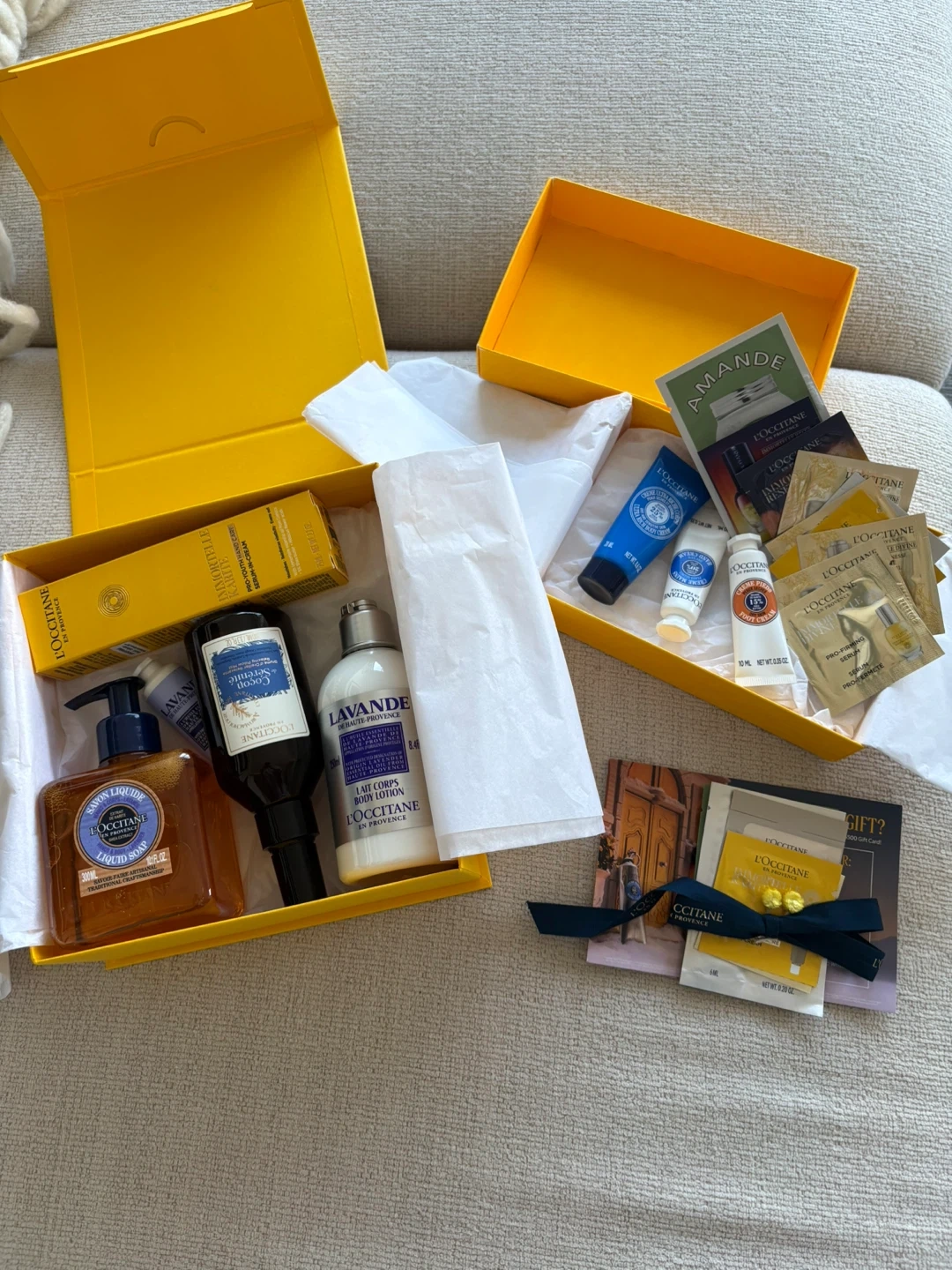 I have some L'Occitane gift sets available. They include a variety of skincare and body care products such as liquid soap, body lotion, hand cream, and more. These sets are perfect for gifting or treating yourself to some luxurious self-care