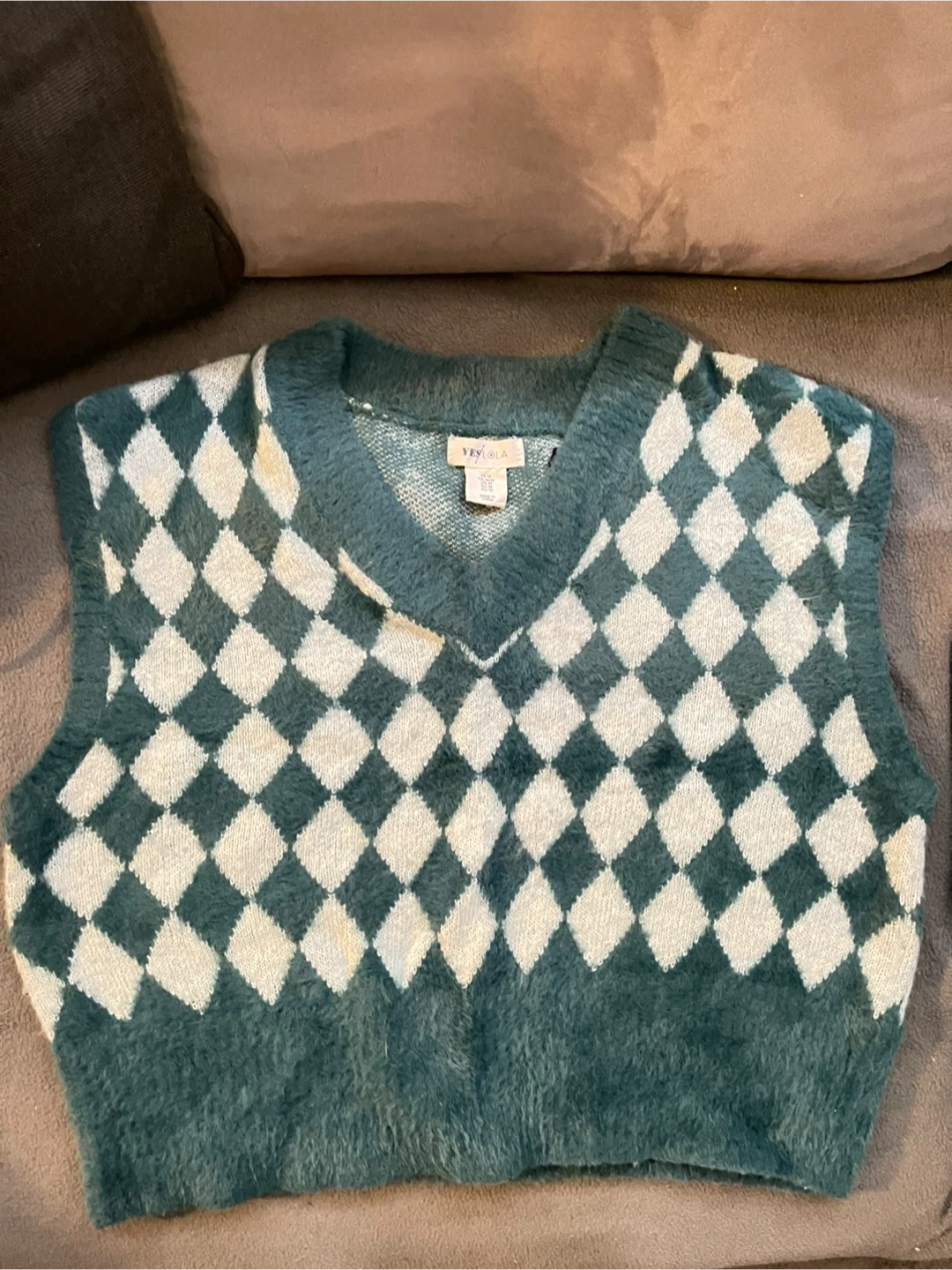 Selling a Yes Lola argyle sweater vest in size medium! It's a cute and cozy piece, perfect for layering or wearing on its own. The green and white diamond pattern is super stylish!