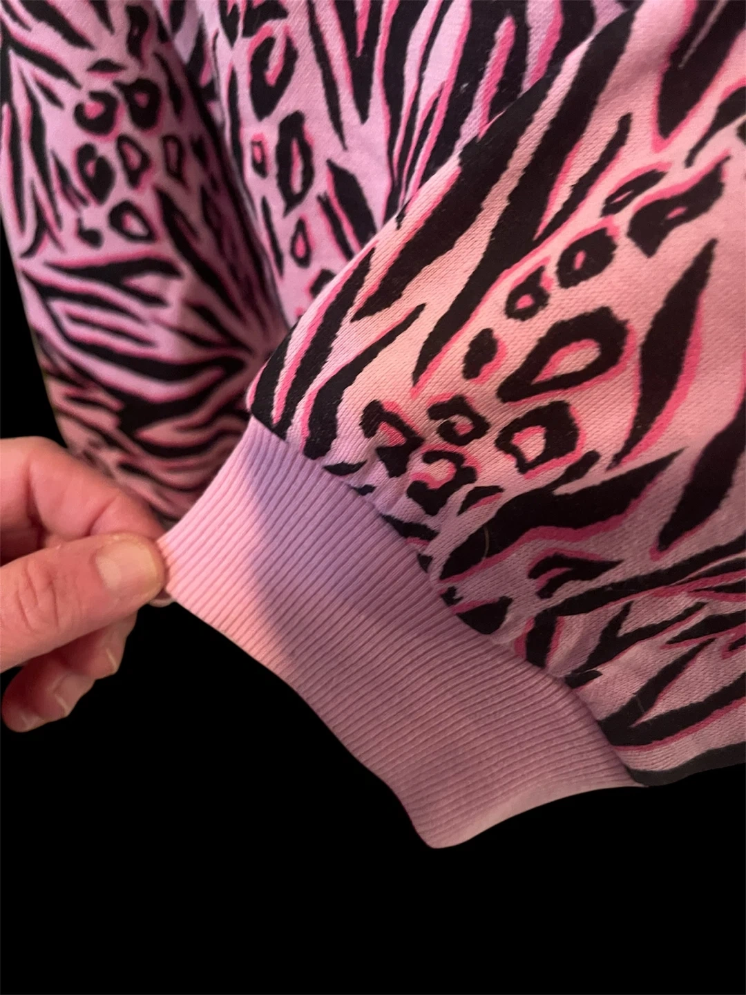 Cute H&M sweater with a fun pink and black animal print! It's a size medium and in great condition. Perfect for adding a pop of colour to your wardrobe. Draw string to tighten the sweater or not. See pictures for details.