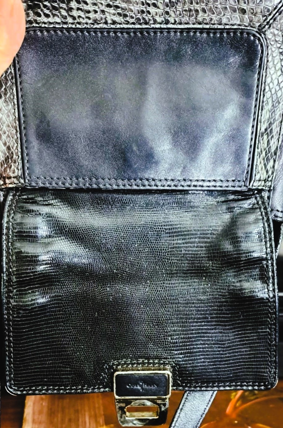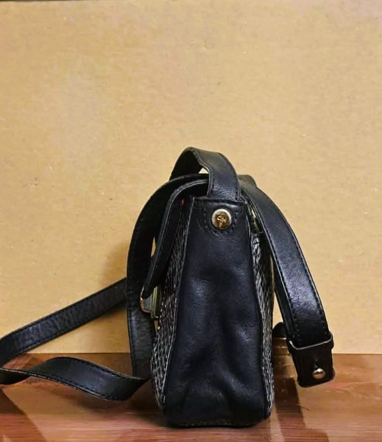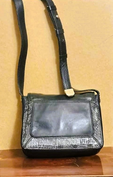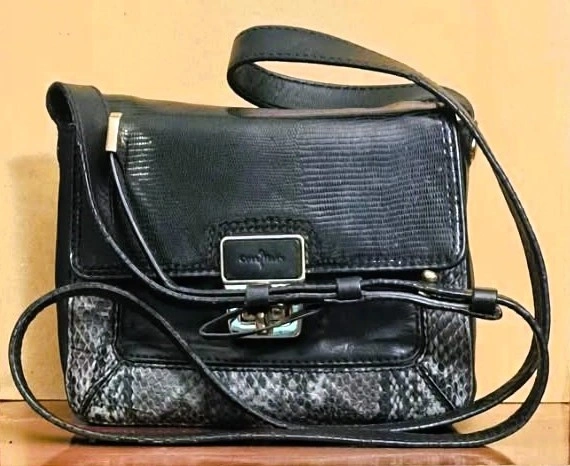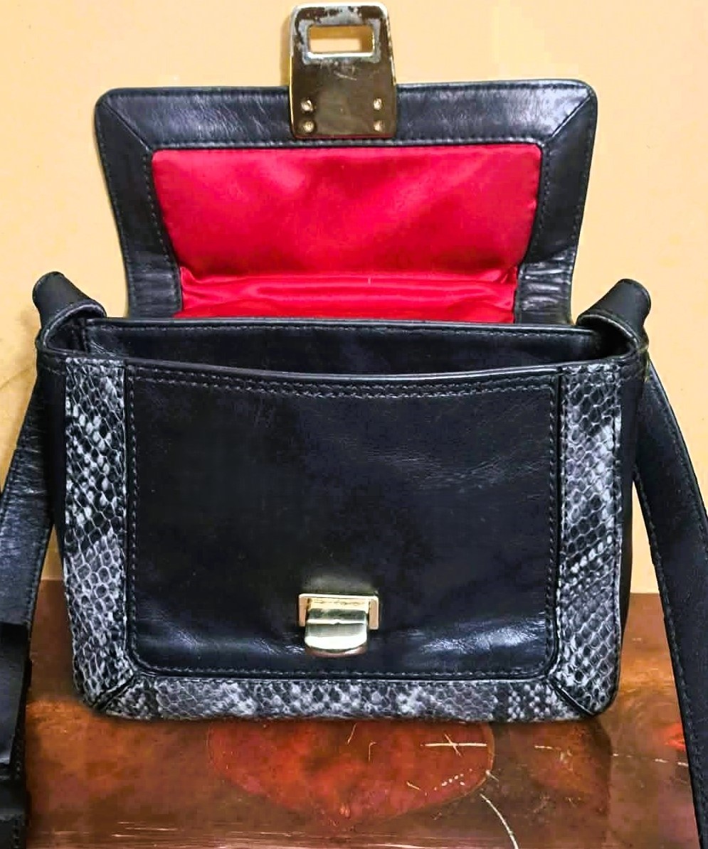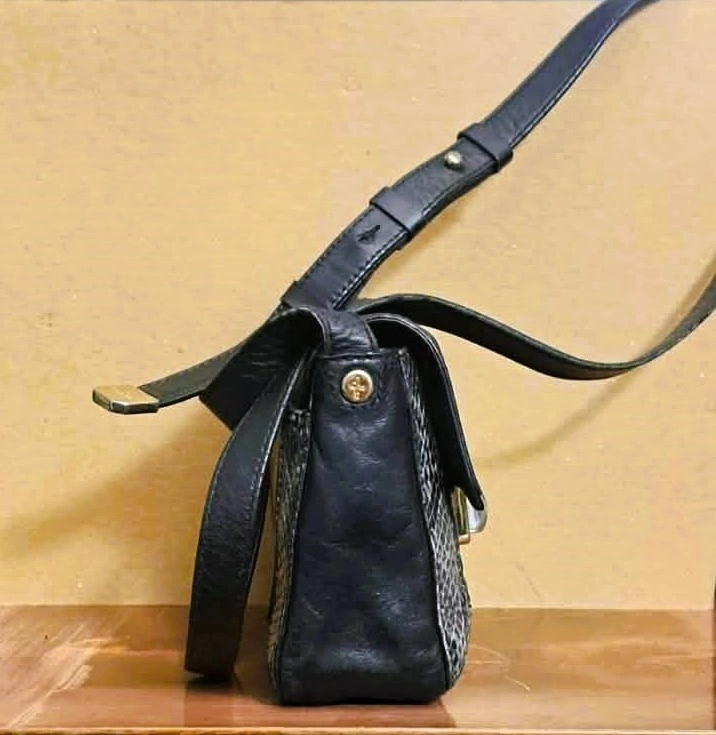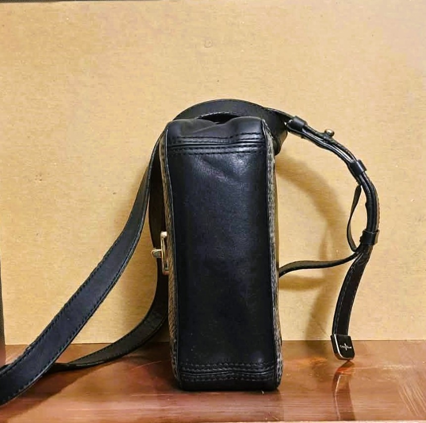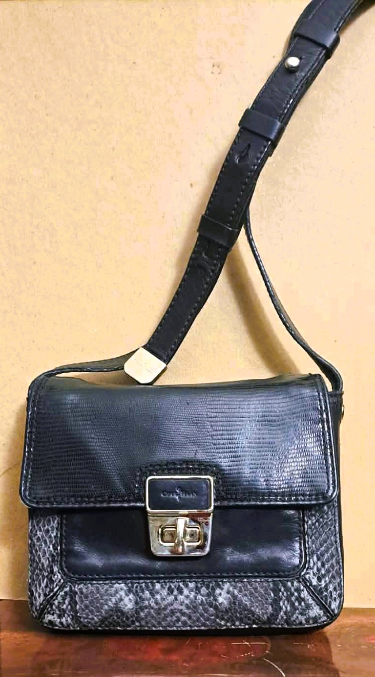 Step back in time with this classic vintage Cole Haan crossbody bag, embodying the chic simplicity of the late 90s and early 2000s (Y2K era). Perfect for everyday essentials and a stylish night out, this bag is crafted from genuine black leather with a striking gray and white snakeskin-embossed accent. The versatile design, compact structure, and adjustable strap make it a must-have addition to any vintage-loving wardrobe. Authentic Y2K aesthetic with a structured, compact shape and bold hardware typical of the 90s and early 2000s.